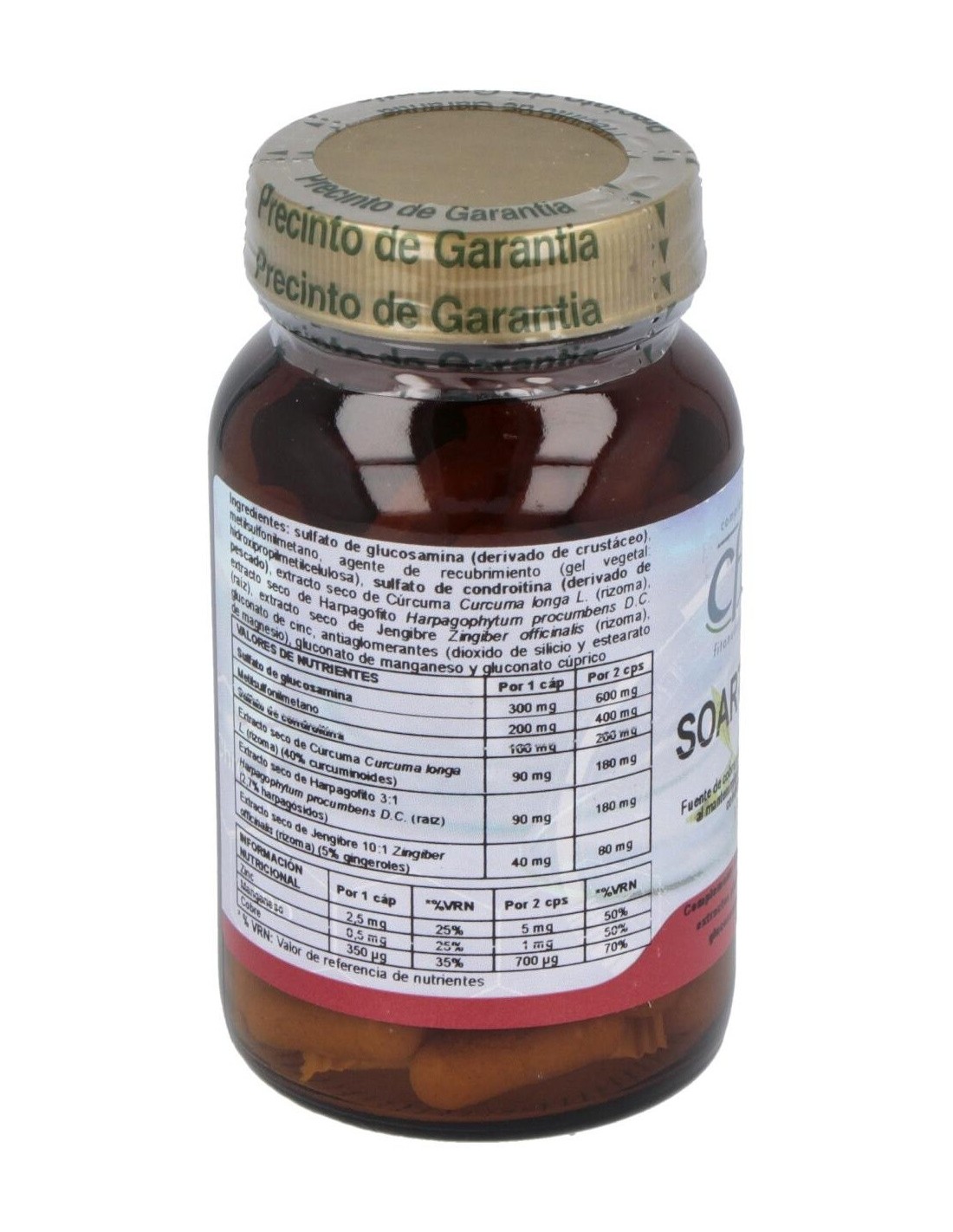 Sulfato de glucosamina 300 mg; Metil sulfonil metano (MSM) 200 mg; Sulfato de Condroitina 100 mg;. Manganeso (aminoquelado) 0,5 mg; Cobre aminoquelado 0,25 mg; Zinc (aminoquelado) 17% CDR 2,5 mg; Ext. estandarizado de Curcuma longa 90 mg; Ext. estandarizado de Jengibre 40 mg; Ext. estandarizado de Harpagofito 90 mg.