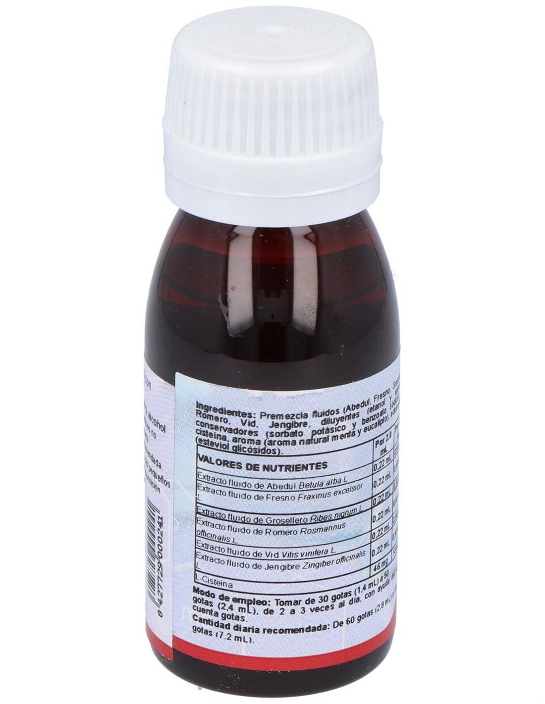 Por 1.4 ml: L-Cisteína (23 mg), Extracto fluido de fresno (0.11 ml), Extracto fluido de vid (0.11 ml), Extracto fluido de abedul (0.11 ml), Extracto fluido de Romero (0.11 ml), Extracto fluido de jengibre (0.11 ml), Extracto fluido de Grosellero (0.11 ml), Extracto vegetal hidroalcohólico de abedul.