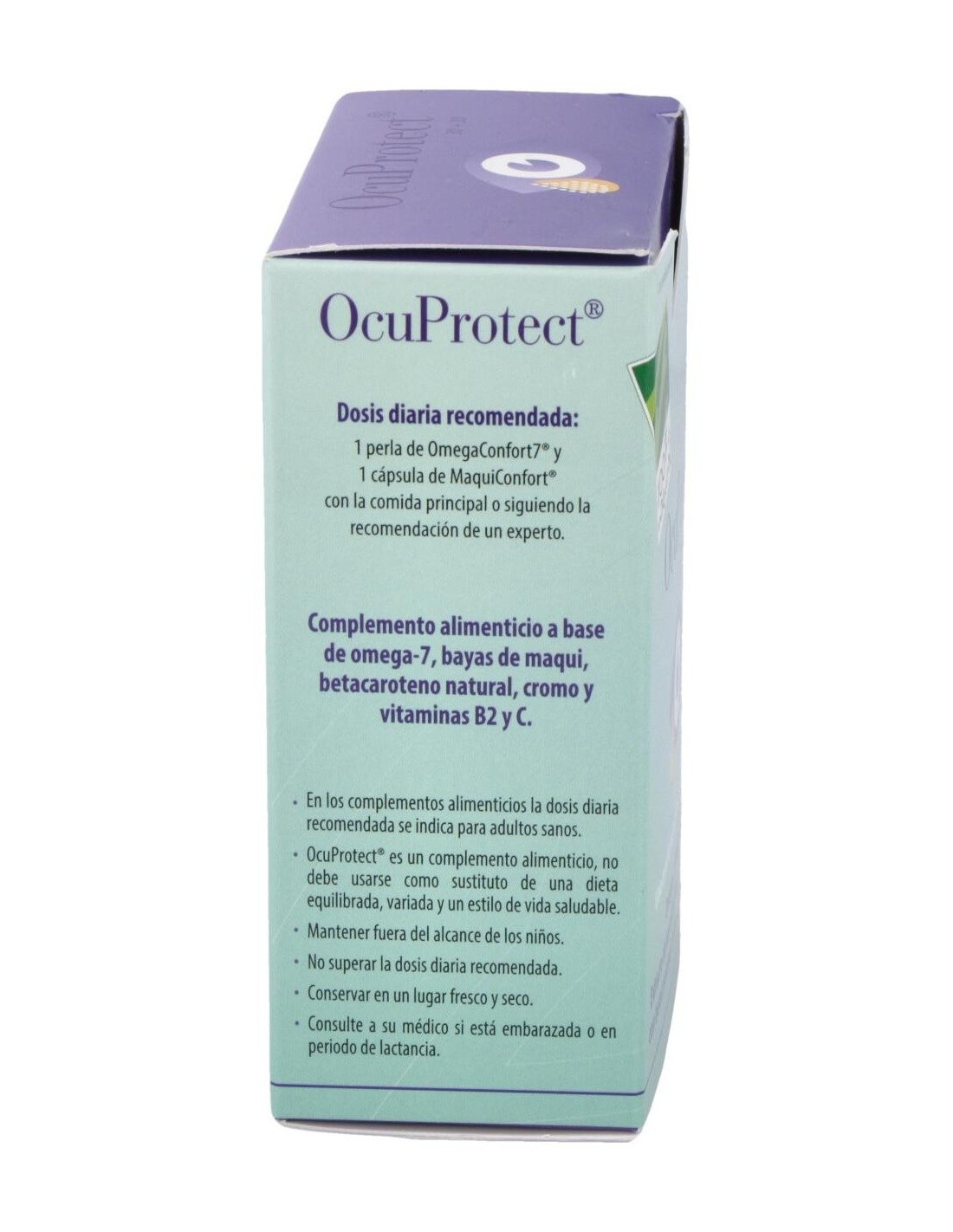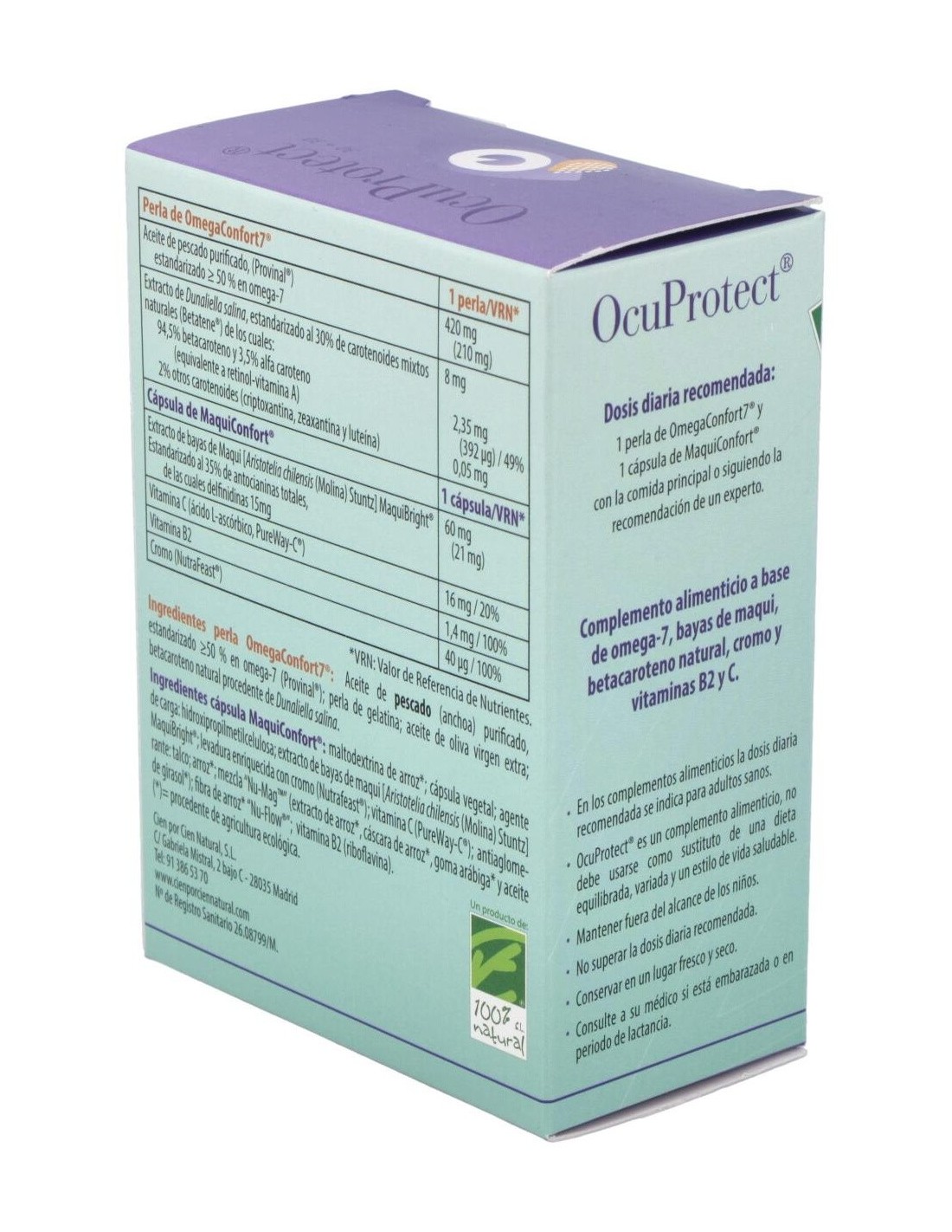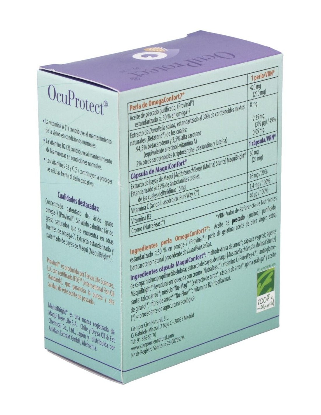 Por 1 cápsula lila: almidón pregelatinizado, cápsula vegetal, extracto de bayas de maqui Maquibright (60 mg), extracto seco de dunaliella salina teod (12,63 mg), silicato de magnesio, sales de magnesio de ácidos grasos y dióxido de silicio.