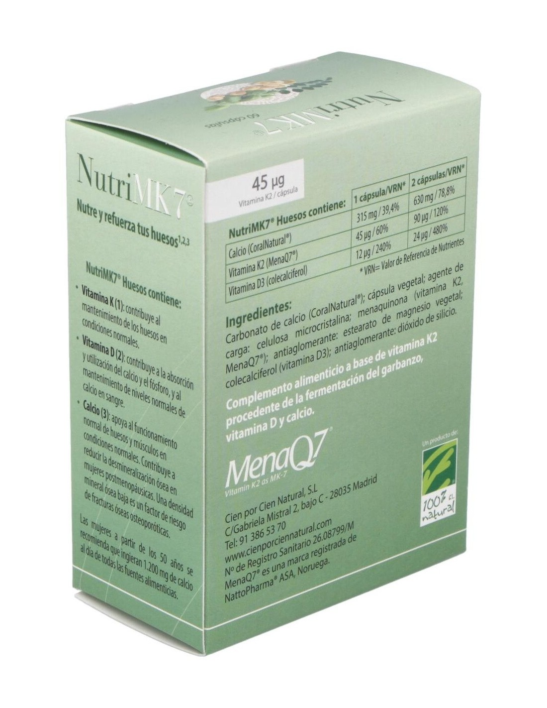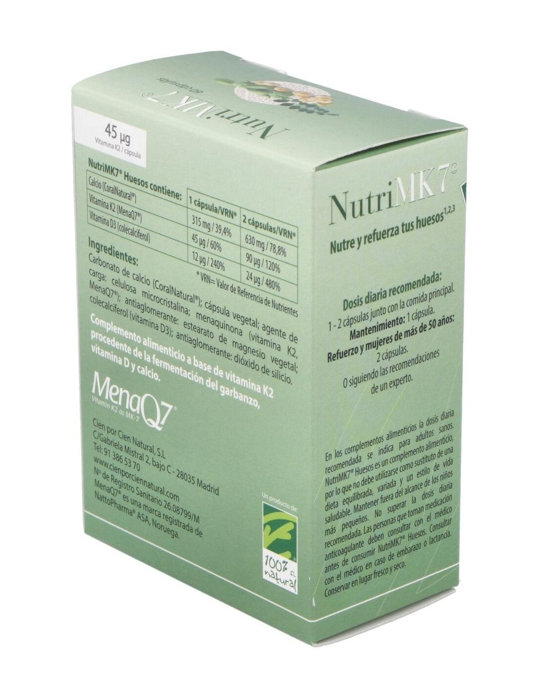 Carbonato de calcio (CoralNatural®): antiaglomerante: fosfato bicálcico dihidrato: cápsula vegetal: menaquinona (Vitamina K2, MenaQ7®): antiaglomerantes: estearato de magnesio y dióxido de silicio: colecalciferol (vitamina D3).