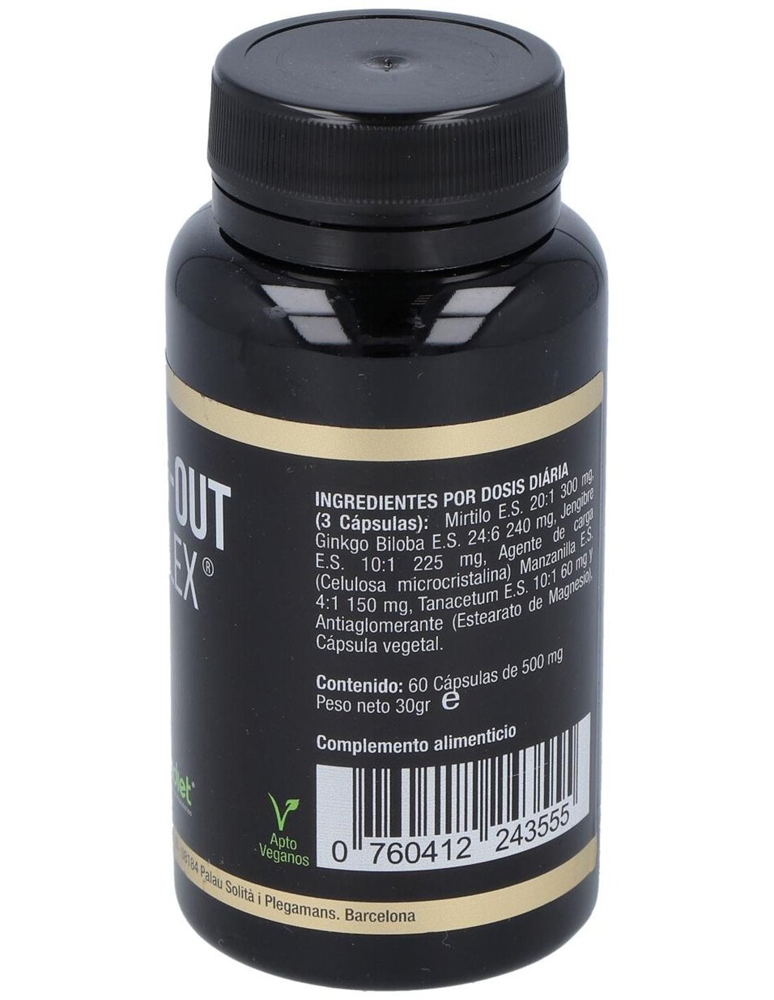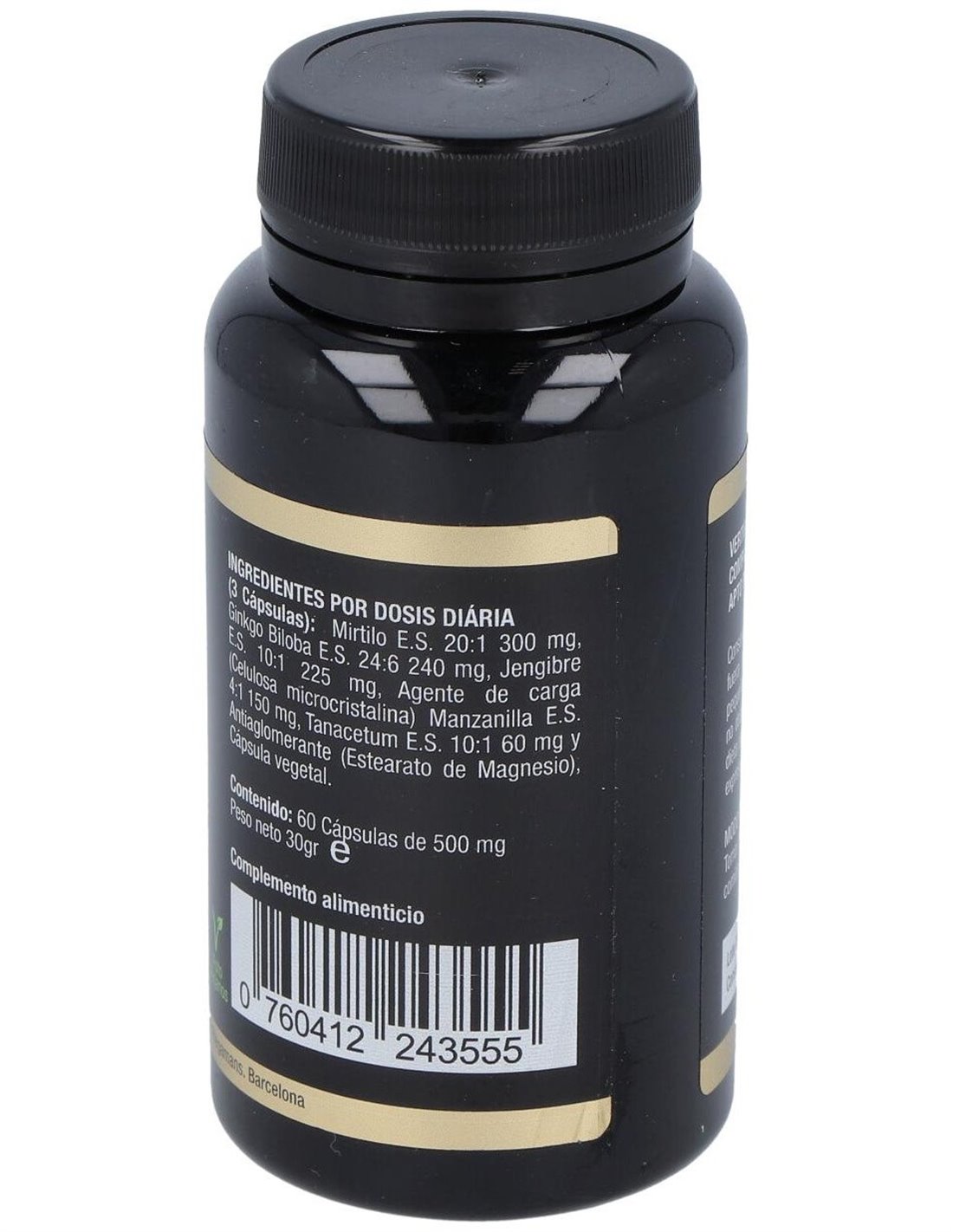 Mirtilo 300 mg (extracto seco 20:1), ginkgo biloba 240 mg (extracto seco 24:6), jengibre 225 mg (extracto seco 10:1), manzanilla 150 mg (extracto seco 4:1), tanacetum 60 mg (extracto seco 10:1), calulosa microcristalina, estearato de magnesio, cápsula vegetal.