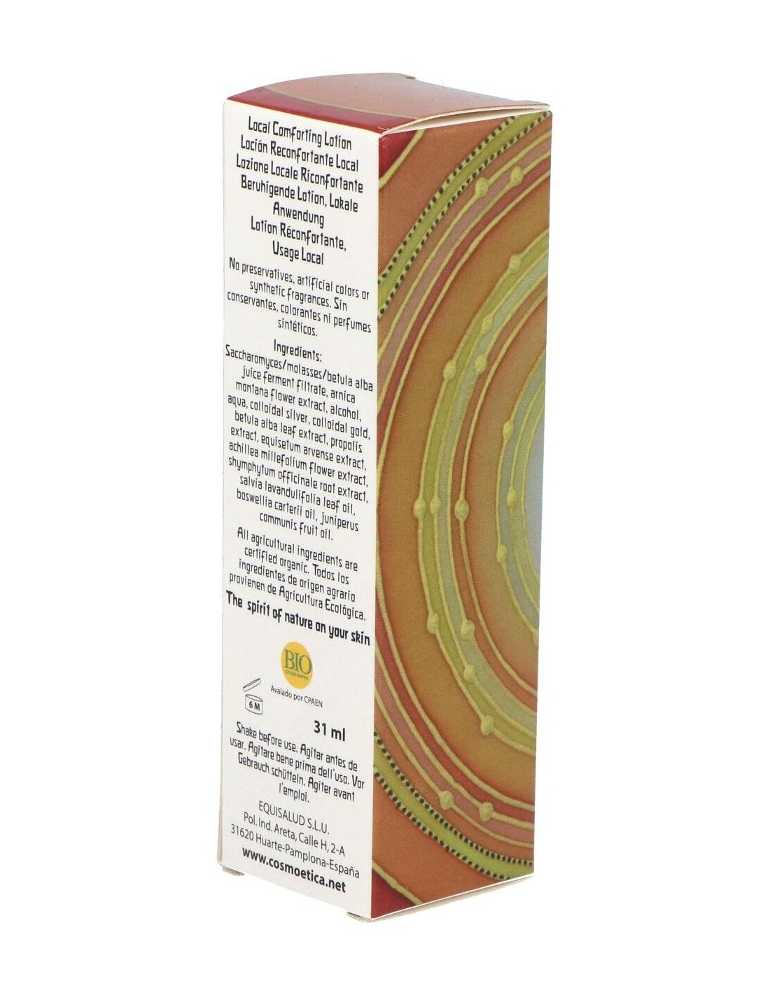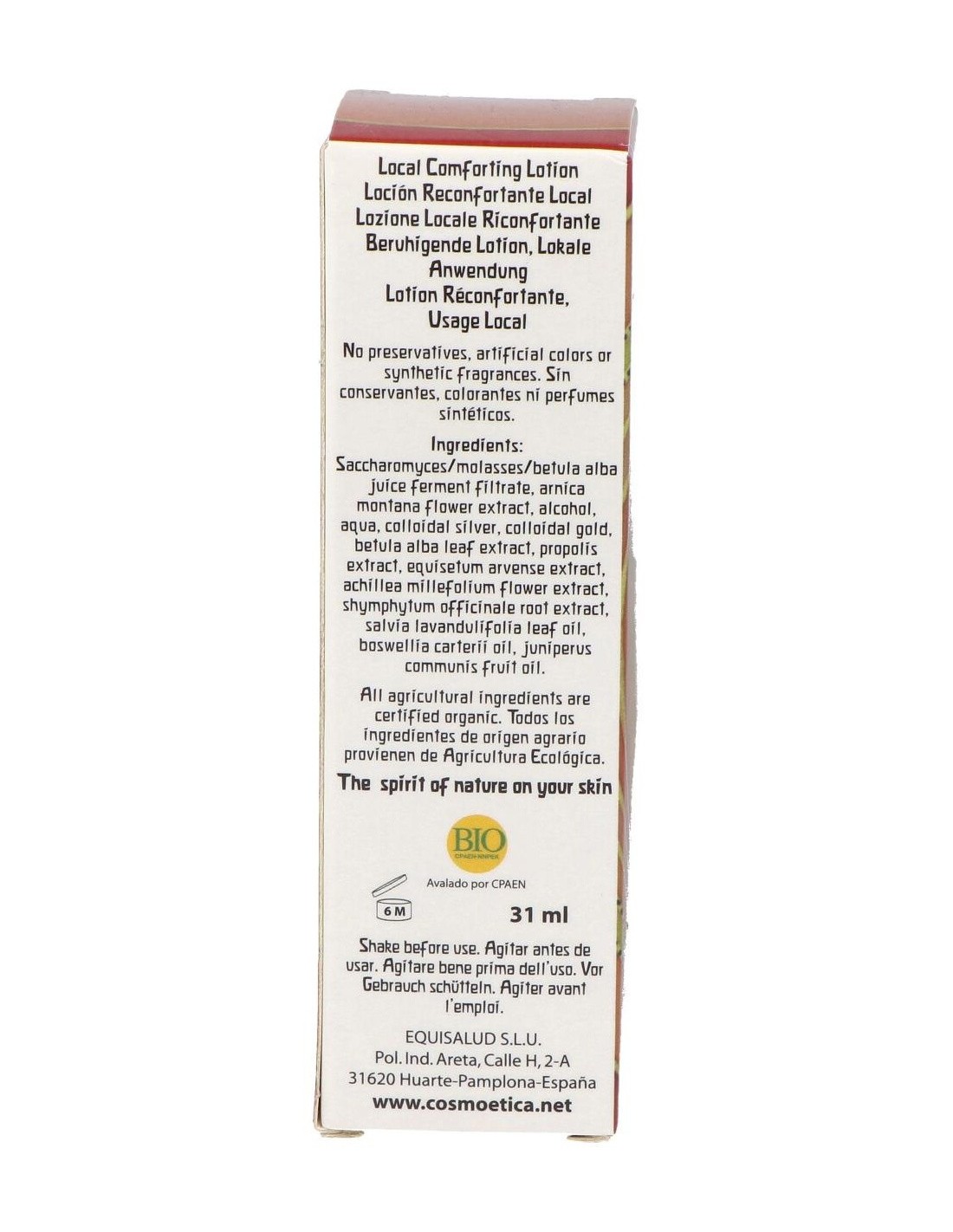 Saccharomyces/Molasses/Betula Alba Juice Ferment Filtrate*, Alcohol*, Aqua, Arnica Montana Flower Extract*, Colloidal Silver, Colloidal Gold, Betula Alba Leaf Extract*, Propolis Extract*, Equisetum Arvense Extract*, Achillea Millefolium Flower Extract*, Shymphytum Officinale Root Extract*, Salvia Officinalis Oil*, Boswellia Carterii Oil*, Juniperus Communis Fruit Oil*.