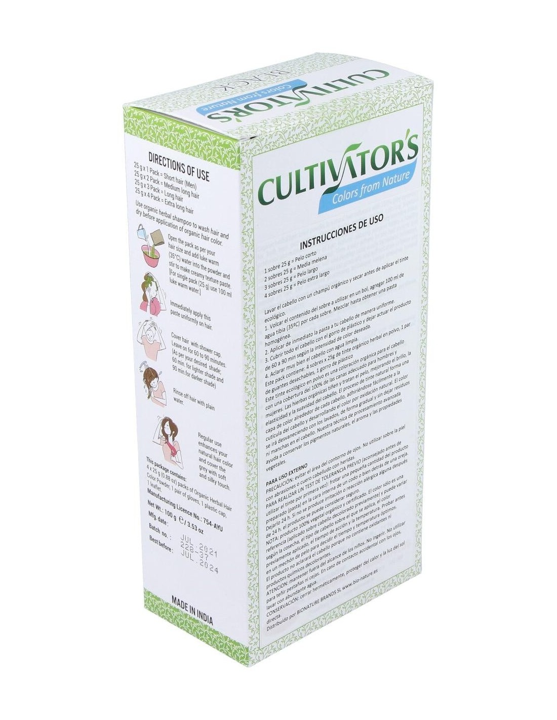 Lavar el cabello con un champú orgánico y secar antes de aplicar el tinte ecológico. Abrir el sobre o los sobres a utilizar según largo del pelo y volcar el contenido en un bol, agregar 100 ml de agua tibia (35ºC) por cada sobre. Mezclar hasta obtener una pasta homogénea. Aplicar de inmediato la pasta a tu cabello de manera uniforme. Cubrir todo el cabello con el gorro de plástico y dejar actuar el producto de 60 a 90 min según intensidad de color deseada (60 min para obtener un tono más claro y 90 min para la máxima intensidad de cada color). Aclarar muy bien el cabello con agua limpia.