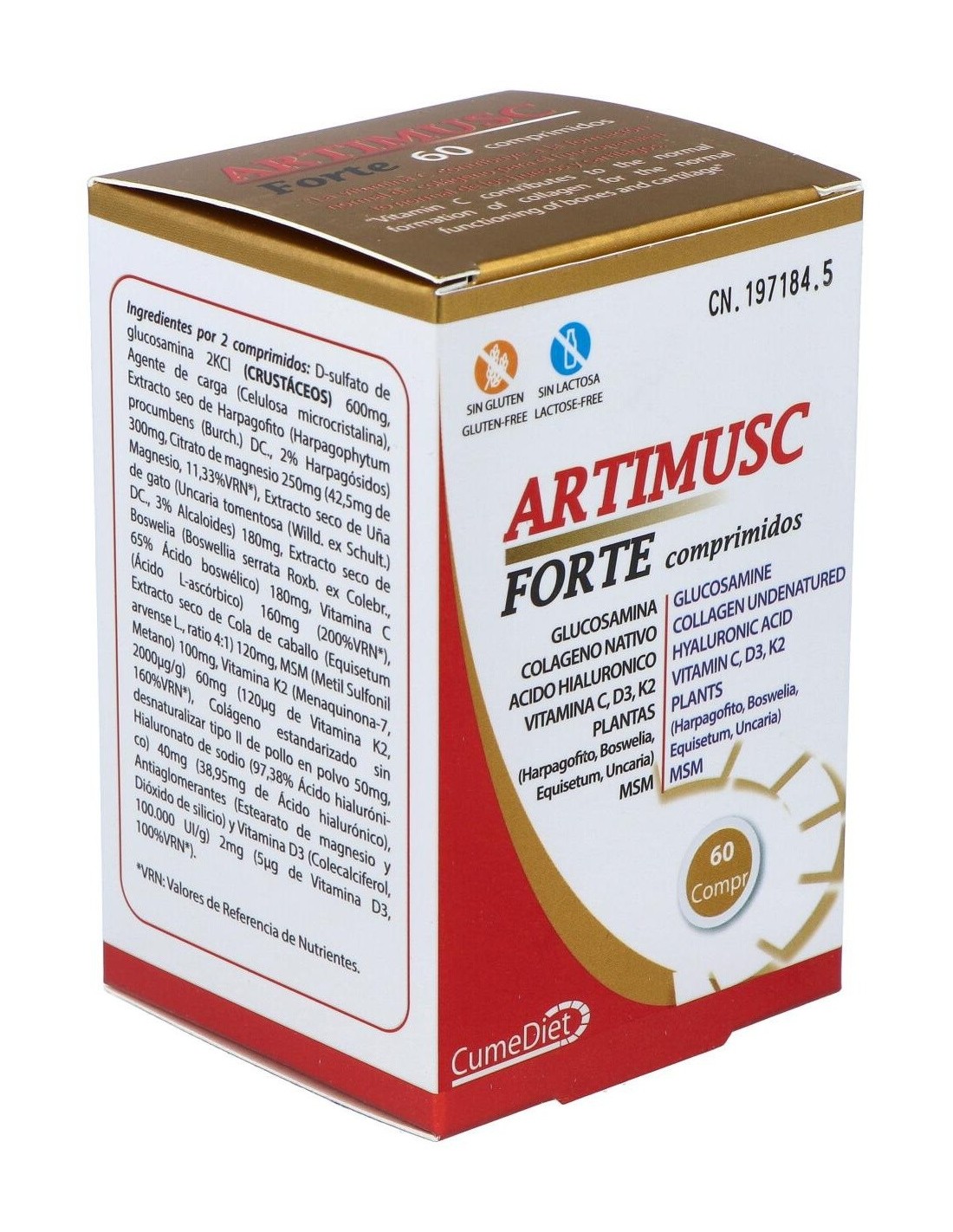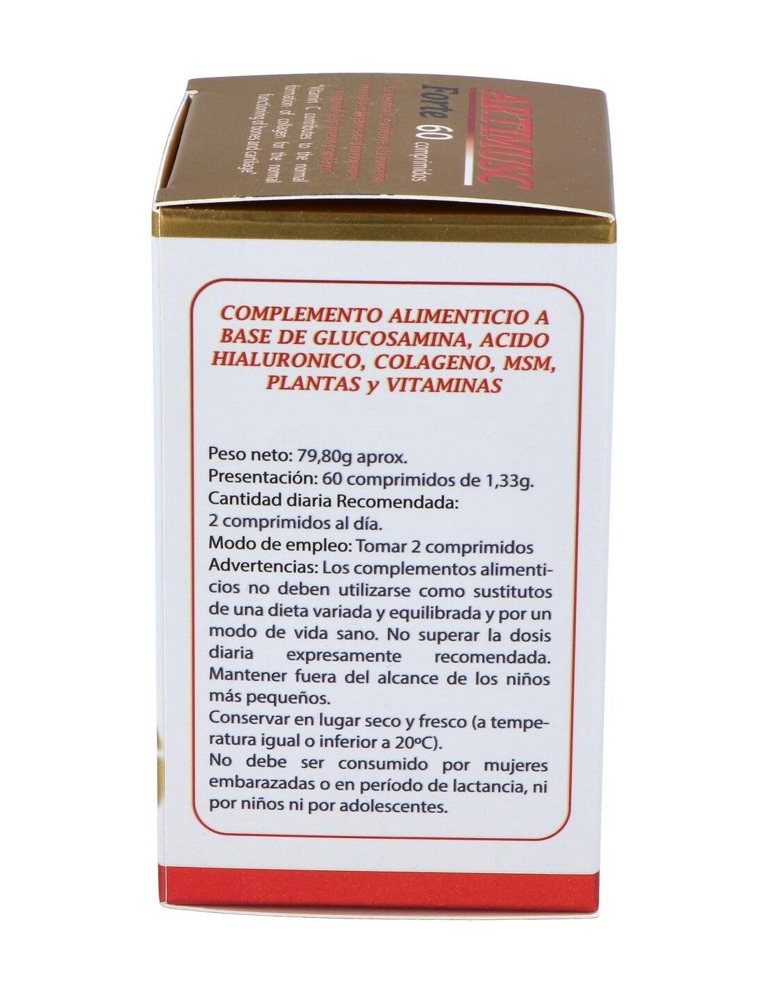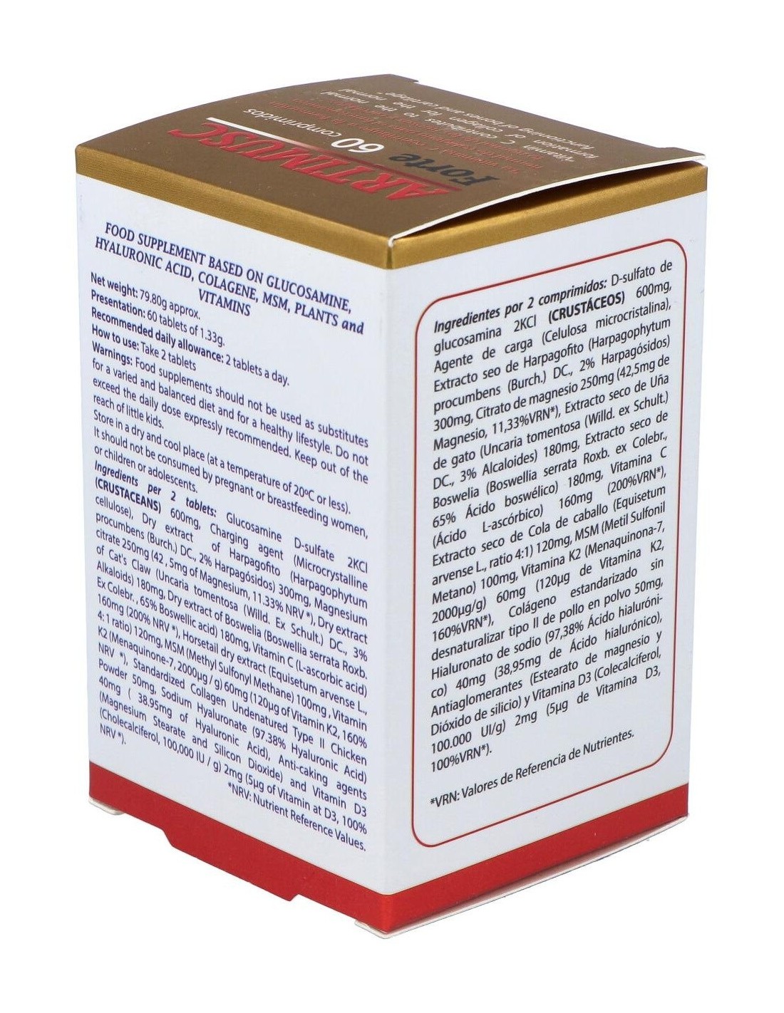 Glucosamina d-sulfato 2kcl (600 mg), Magnesio citrato (250 mg), Harpagofito extracto seco (2% harpagósidos)(300 mg), Vitamina C (ácido l ascórbico)(160 mg), Colágeno nativo tipo II (50 mg), Hialuronato sódico (40 mg), Cola de caballo extracto seco (equisetum arvensis)(120 mg), Uña de gato (Uncaria tormentosa)(180 mg), Boswellia serrata (180 mg), MSM polvo (100 mg), Vitamina K2 2000 ppm (60 mg), Vitamina D3 100,000 UI/g (2 mg), Celulosa microcristalina (agente de carga), Estearato de magnesio y dióxido de silicio (Antiaglomerantes).