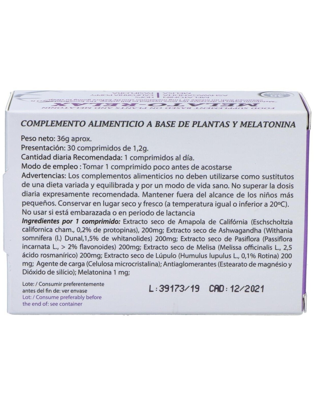 Amapola de California (eschscholtzia californica cham) 200 mg, ashwagandha (withania somnifera l. dunal) 200 mg, passiflora (passiflora incarnata L.) 200 mg, melissa (melissa officinalis l.) 200 mg, lúpulo (humulus lupulus) 200 mg, celulosa microcristalina, estearato de magnesio, dióxido de silicio, melatonina 1 mg.