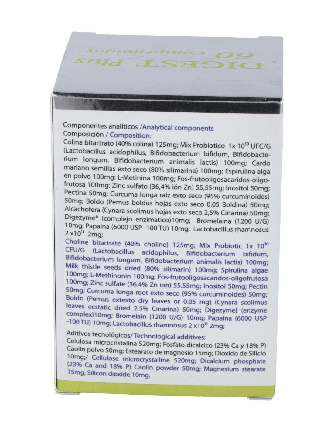 Colina bitartrato (40% colina) 125 mg: Mix Probiotico 1x 1010 UFC/G (Lactobacillus acidophilus, Bifidobacterium bifidum, Bifidobacterium longum, Bifidobacterium animalis lactis) 100 mg: Cardo mariano semillas exto seco (80% silimarina) 100 mg: Espirulina alga en polvo 100 mg: L-Metinina 100 mg: Fos-frutooligosacaridos oligofrutosa 100 mg: Zinc sulfato (36,4% ión Zn) 55,55 mg: Inositol 50mg: Pectina 50 mg: Curcuma longa raíz exto seco (95% curcuminoides) 50 mg: Boldo (Pemus boldus hojas exto seco 0,05 Boldina) 50 mg: Alcachofera (Cynara scolimus hojas exto seco 2,5% Cinarina) 50 mg: Digezyme® (complejo enzimatico)10 mg: Bromelaina (1200 U/G) 10 mg: Papaina (6000 USP -100 TU) 10 mg: Lactobacillus rhamnosus 2 x1011 2 mg: