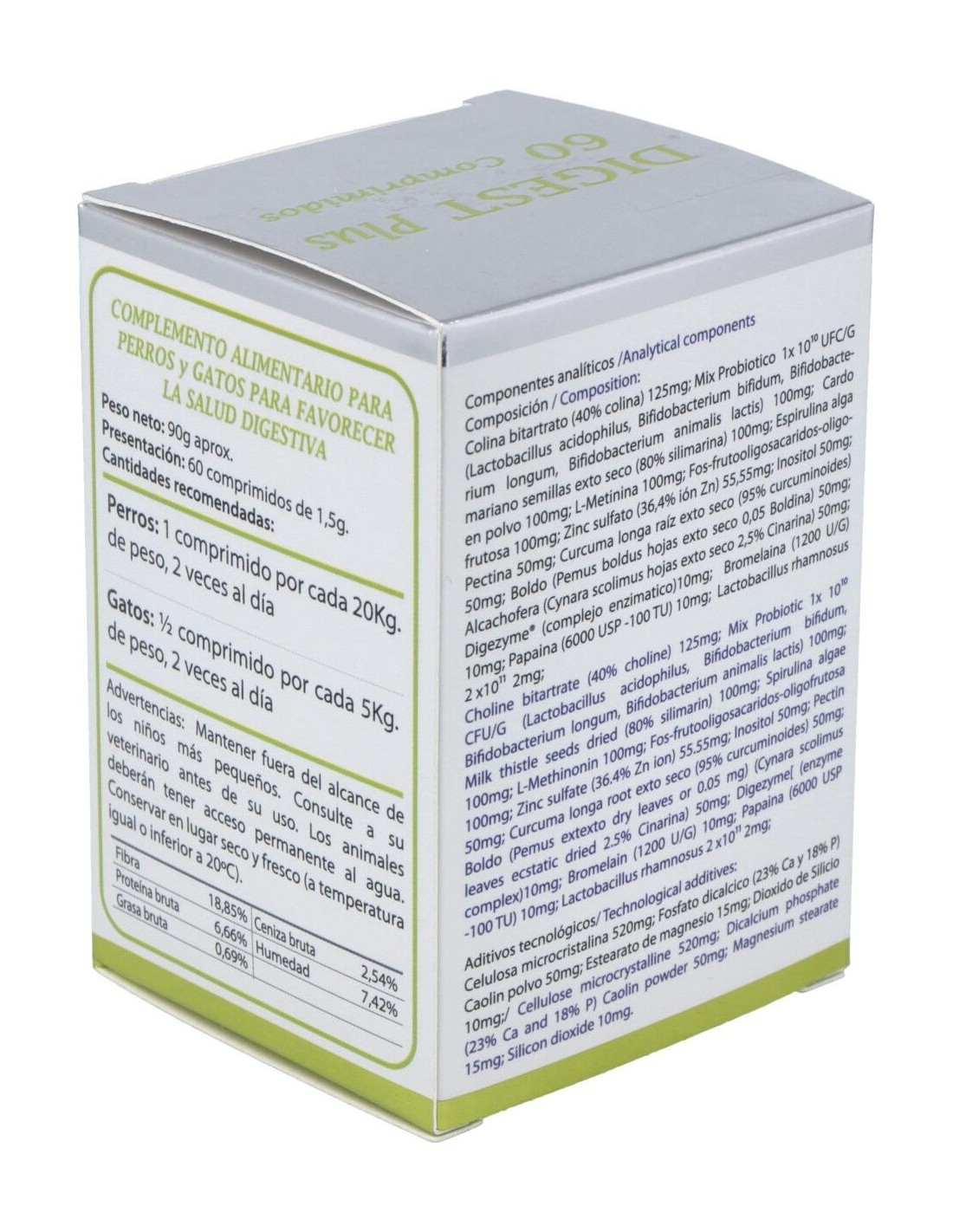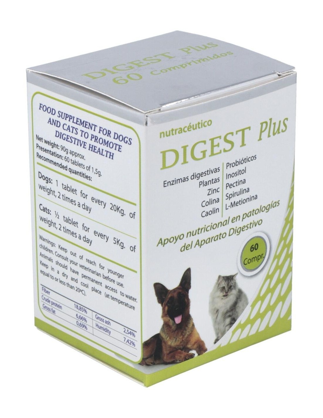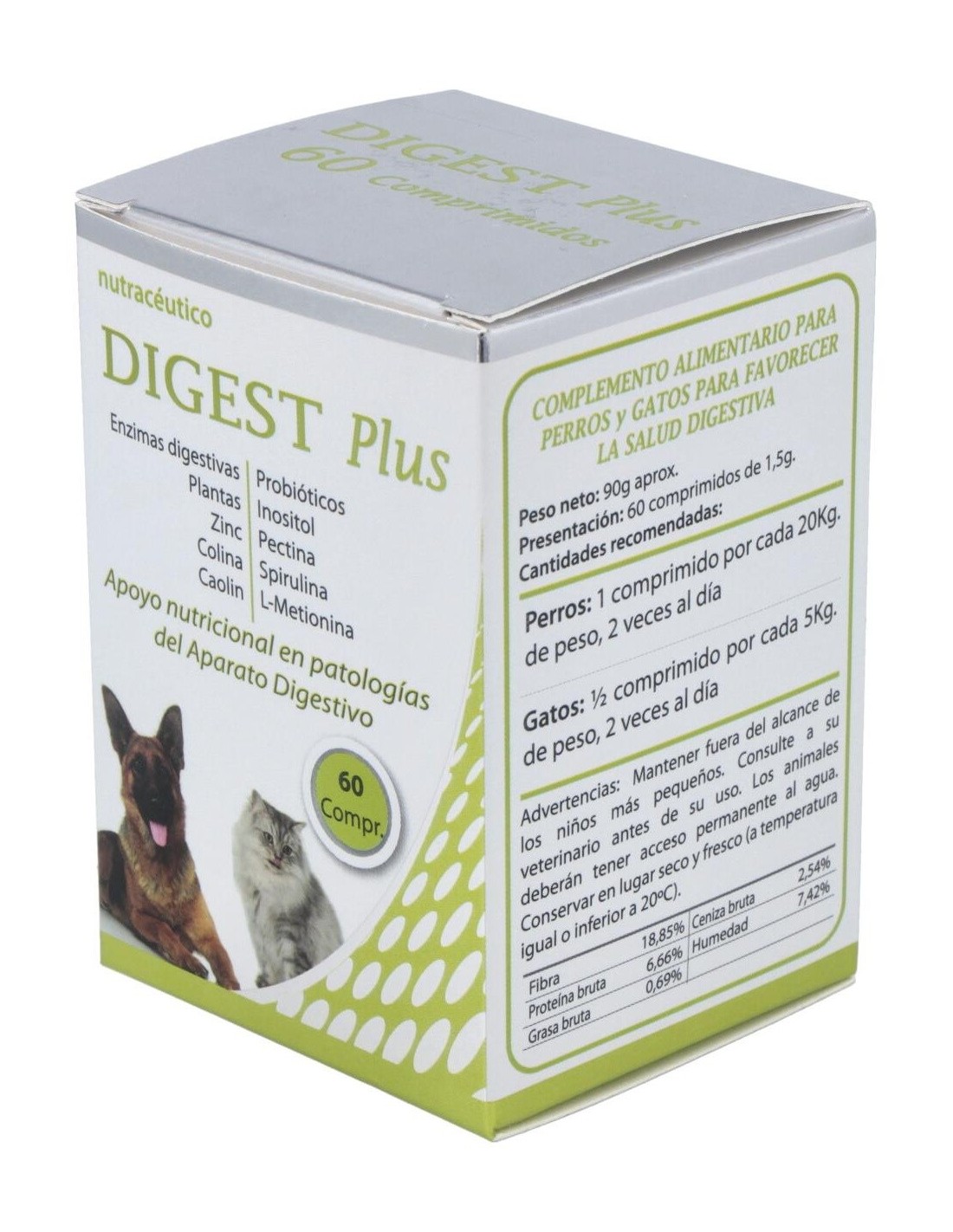Complemento alimenticio a base de enzimas digestivas, probióticos, plantas, inositol, colina, pectina, caolin, spirulina, L-metionina y zinc para favorecer la salud digestiva de perros y gatos. Complemento alimenticio a base de enzimas digestivas, probióticos, plantas, inositol, colina, pectina, caolin, spirulina, L-metionina y zinc para favorecer la salud digestiva de perros y gatos.