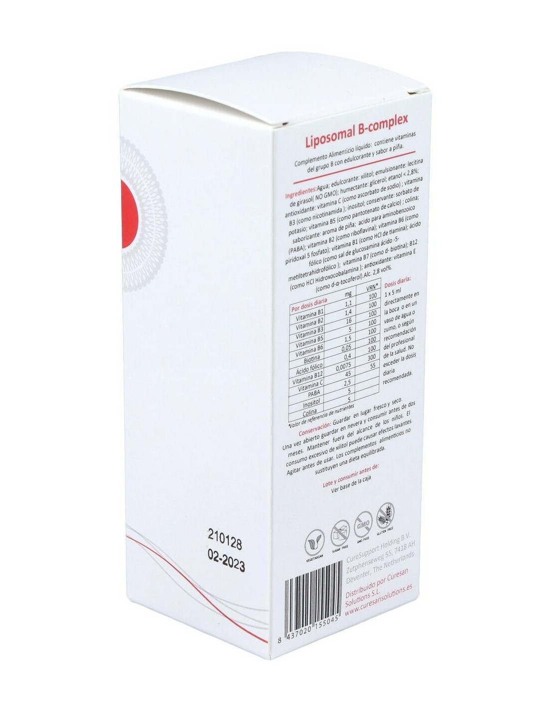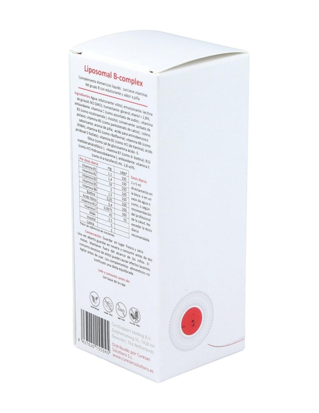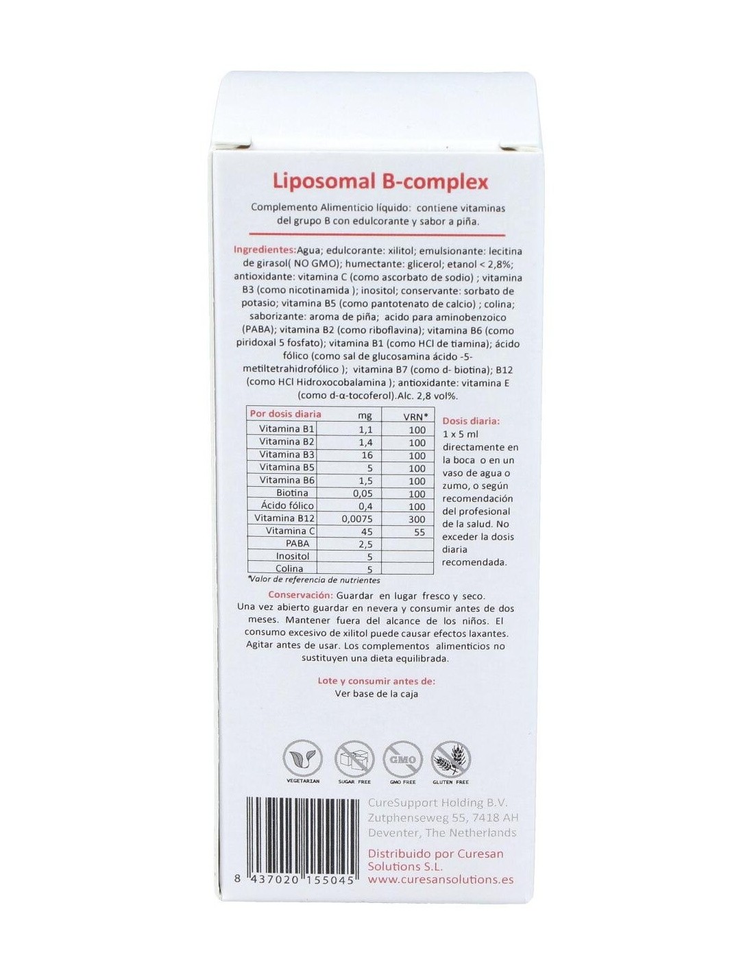 Complemento alimenticio líquido Liposomal B-complex. Fórmula liposomada que incluye todas las vitaminas del grupo B + colina + PABA + Inositol. Sabor a piña.