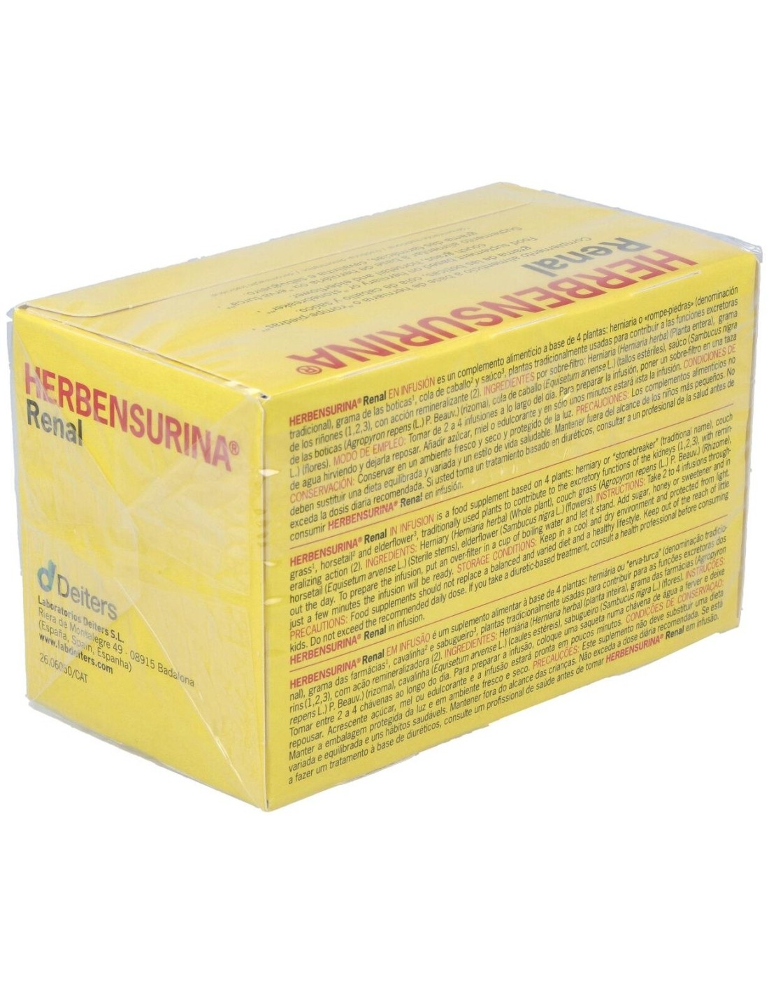 DEITERSHERBENSURINA | Herbensurina 40 sobresHerbensurina es un complemento alimenticio en forma de sobres-filtro para infusión con una cuidada mezcla de plantas que ayudan al bienestar de las vías urinarias y reducen el riesgo de contraer cálculos renales. Los componentes de Herbensurina son:Herniaria glabra: tiene una importante acción diurética.