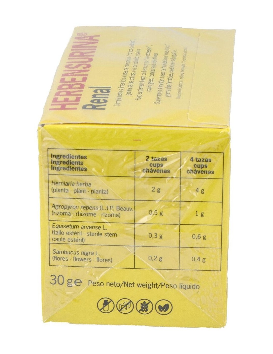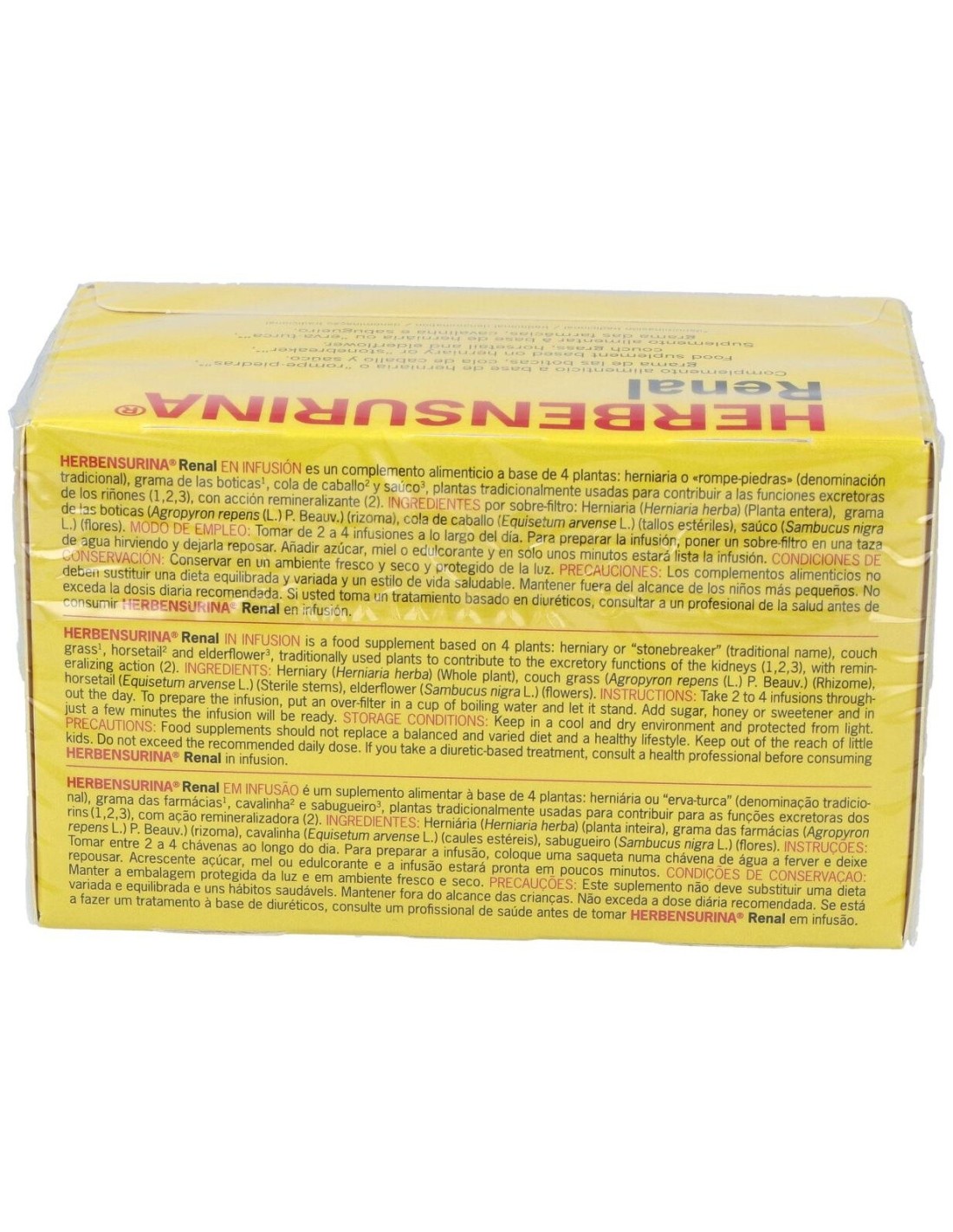 Herbensurina es un complemento alimenticio en forma de sobres-filtro para infusión con una cuidada mezcla de plantas que ayudan al bienestar de las vías urinarias y reducen el riesgo de contraer cálculos renales. Los componentes de Herbensurina son:
