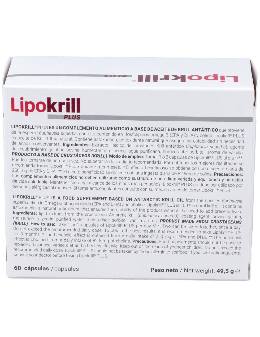 100% aceite de Krill con un alto contenido en fosfolípidos de omega-3 (EPA y DHA) que contribuyen al funcionamiento normal del corazón, a mantener niveles normales de triglicéridos en sangre y a mantener la presión arterial normal. Además gracias a la colina presente en el aceite de Krill, contribuye al metabolismo normal de los lípidos y al funcionamiento normal del hígado.