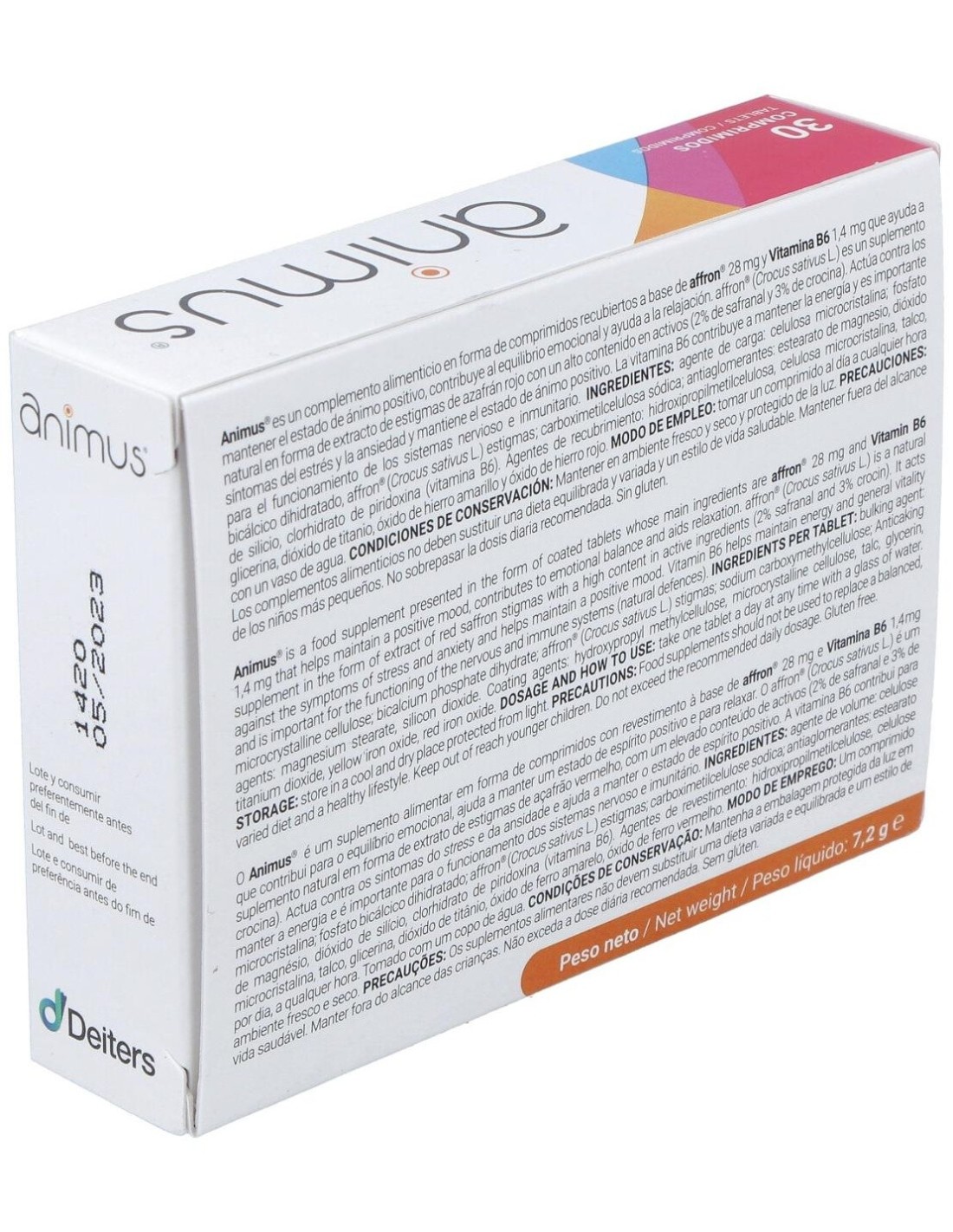DEITERSComplemento alimenticio en forma de comprimidos recubiertos a base de affron® y Vitamina B6 que ayuda a mantener el sistema nervioso en condiciones normales , contribuye al normal equilibrio emocional y apoya la relajación. Complemento alimenticio en forma de comprimidos recubiertos a base de affron® y Vitamina B6 que ayuda a mantener el sistema nervioso en condiciones normales , contribuye al normal equilibrio emocional y apoya la relajación.