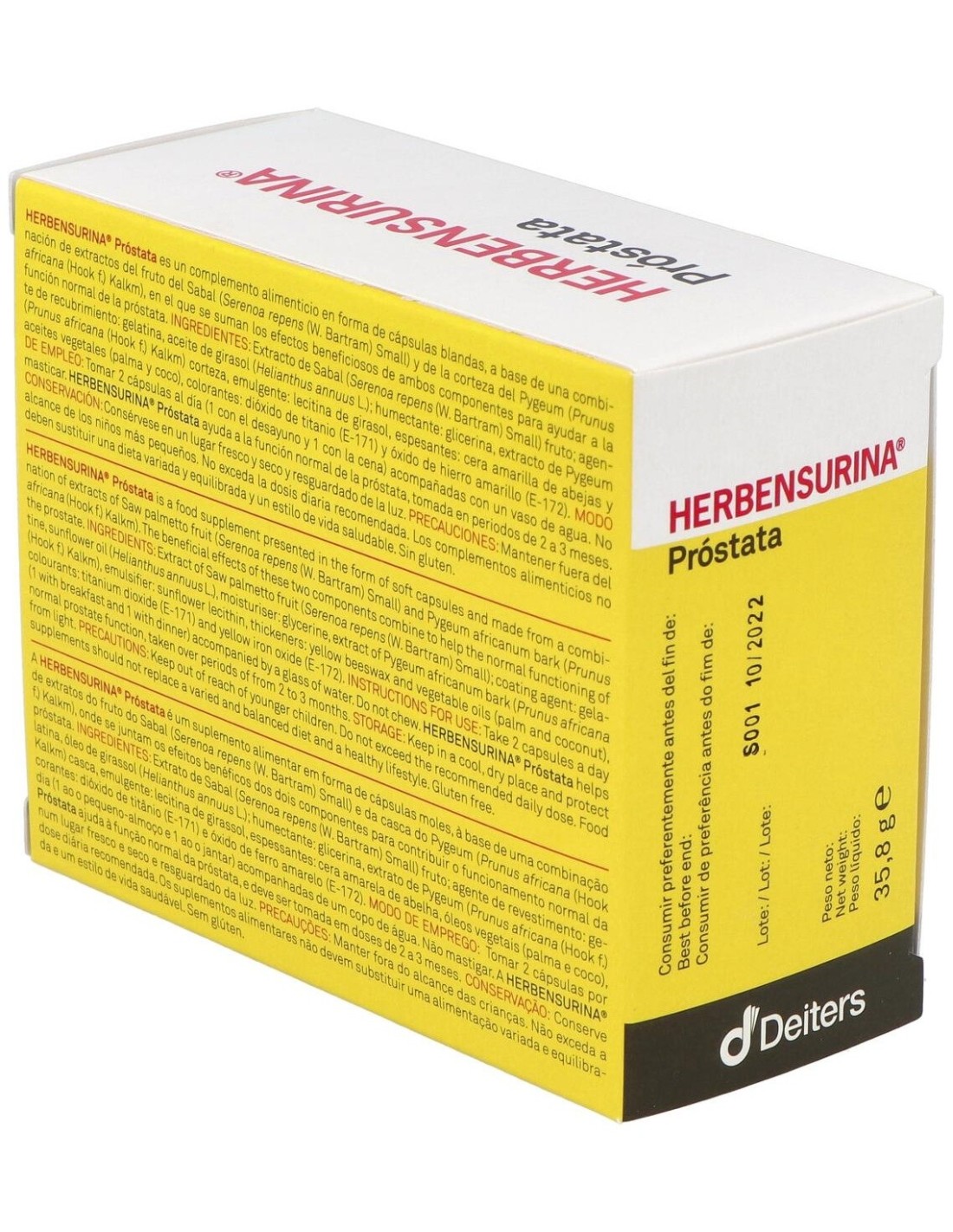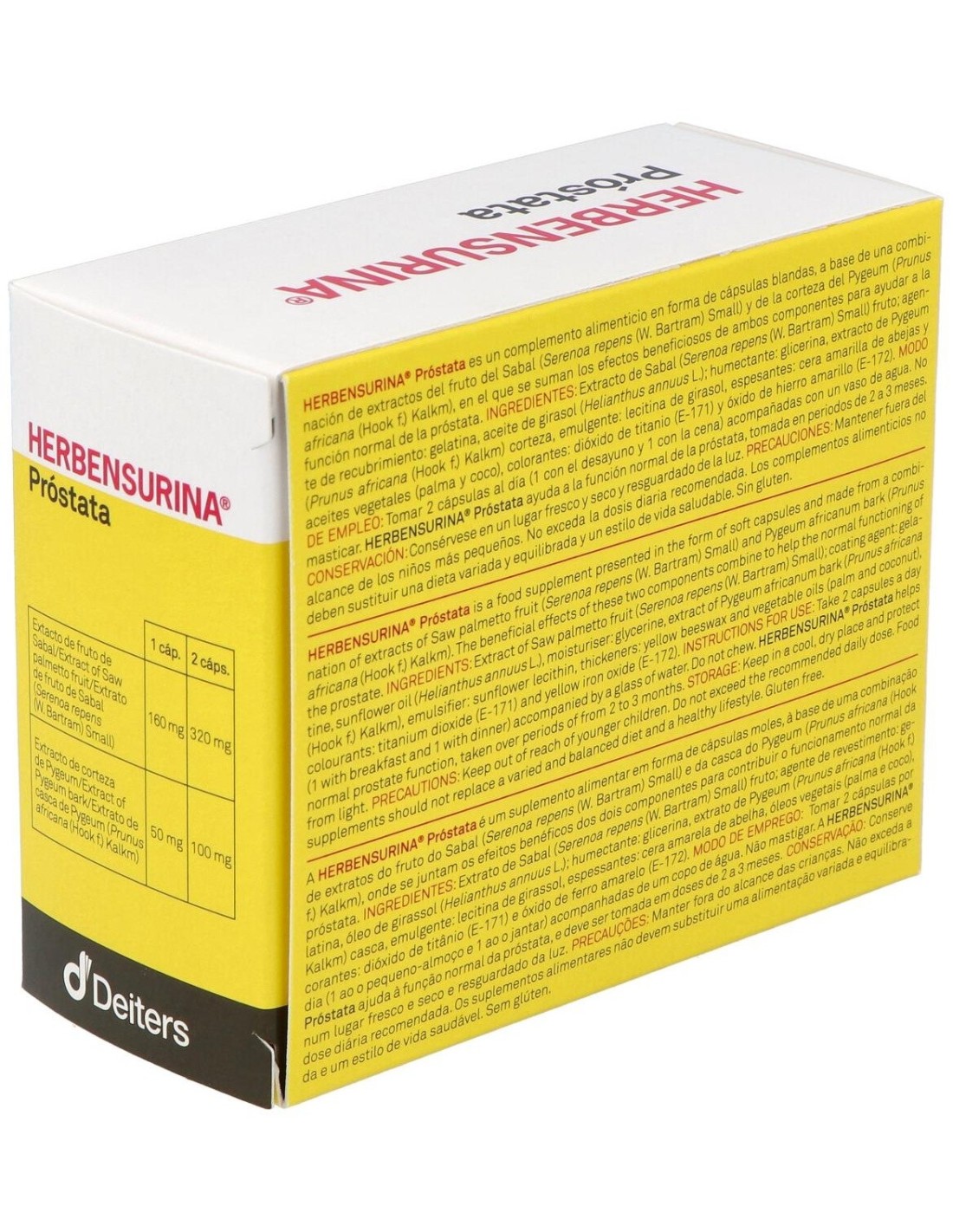 DEITERSHERBENSURINA | Herbensurina Prostata 60 CapsulasHerbensurina Próstata 60 Cápsulas Blandas complemento alimenticio en formato de cápsulas blandas en base de una combinación de extractos del fruto del Sabal y de la corteza del Pygeum, que colaboran en la función normal de la próstata. Mejora la salud urinaria y ayuda a conseguir el flujo urinário máximo.
