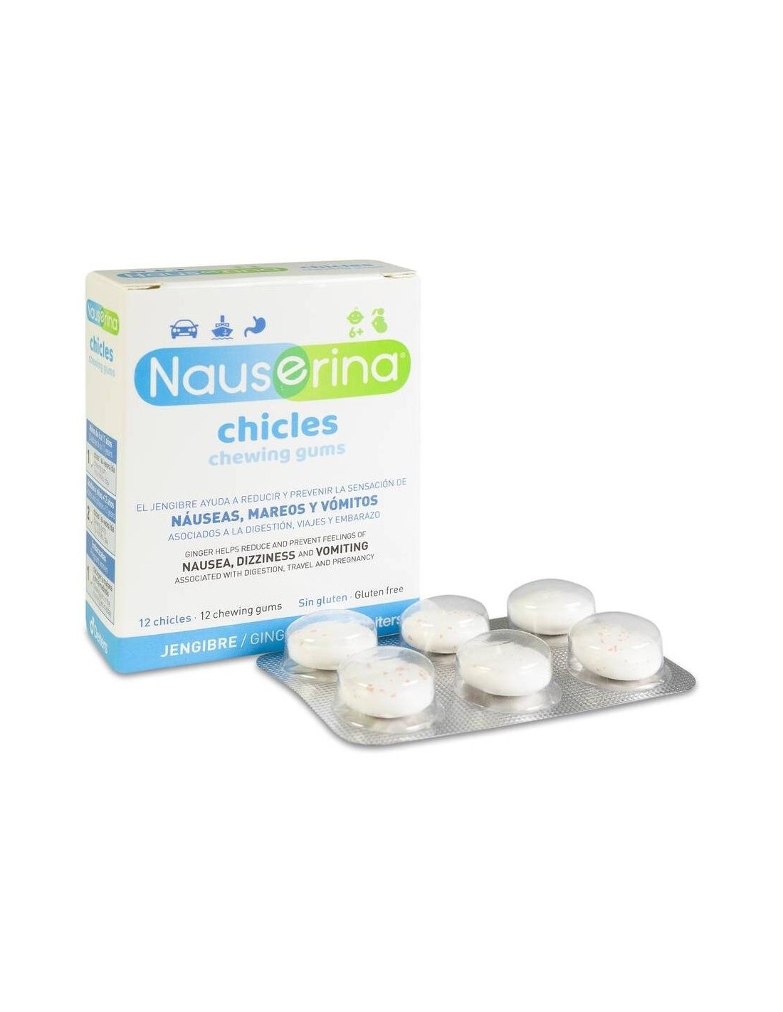 Nauserina 12chicles es un complemento alimenticio a base de extracto de jengibre. Ideal para reducir y prevenir la sensación de náuseas, mareos y vómitos asociados a viajes, digestión y embarazo.