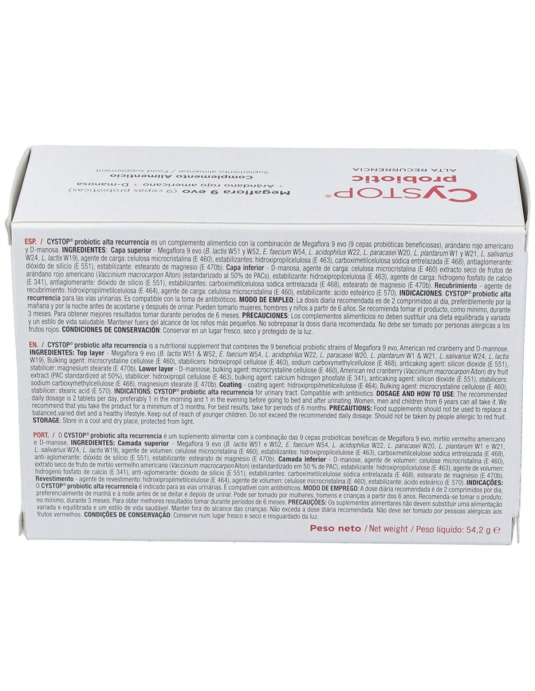 Probiótico con 9 cepas que se activan en el organismo, llegando el 90% vivas al intestino. El Arándano Rojo con D-Manosa, evitan la adhesión y colonización de la E.Coli. Comprimidos bicapa.