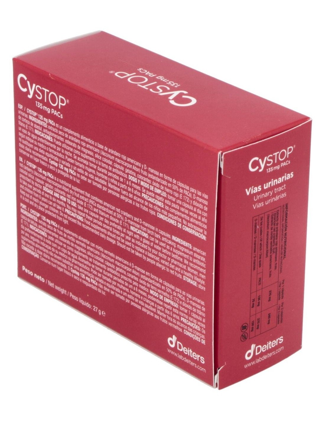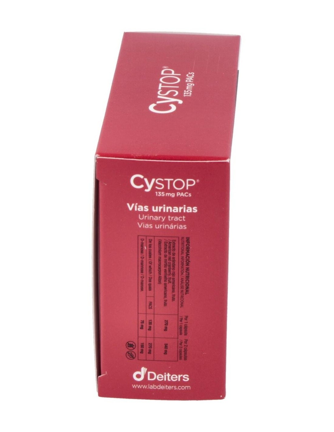 Cystop es un preparado alimenticio a base de arándano rojo americano y D-manosa, específicamente preparado para aportar a tu organismo propiedades que le ayudarán a inhibir la aparición de las molestias urinarias, prevenirlas y mejorar su bienestar tras su presencia. Gracias a su composición, Cystop permite bloquear los factores de adherencia de las bacterias en tu organismo, mejorando la protección y prevención de las molestias urinarias.