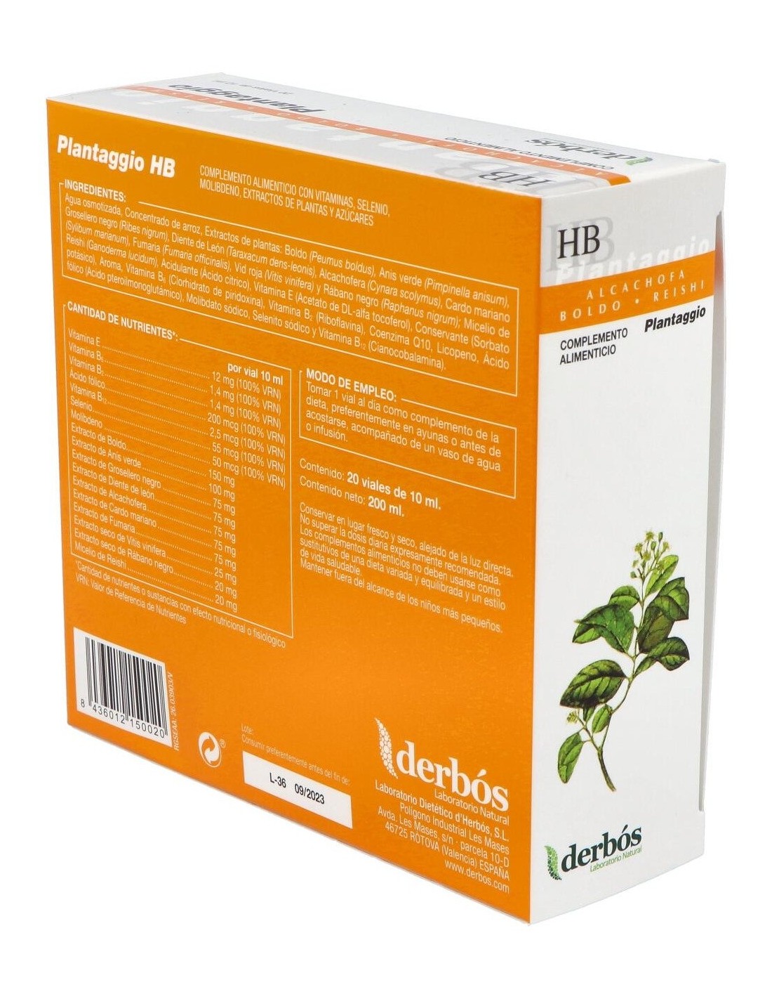 Derbos plantaggio hb es un complemento alimenticio especialmente formulado para favorecer el funcionamiento hepático. Preparado a base de plantas y nutrientes específicos favorece la función hepatico-biliar y ofrece al hígado una protección.