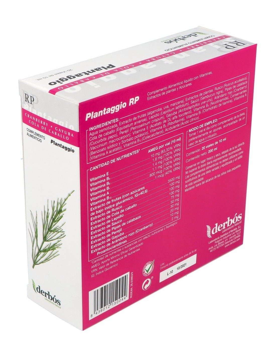 Derbós Plantaggio Rp es un complemento nutricional, enriquecido con ingredientes naturales, ideal para mantener un correcto funcionamiento del sistema urinario. Posee cola de caballo, gayuba y lepidio para calmar el dolor irritante de la infección, y conseguir prevenir al organismo frente al ataque infecioso.