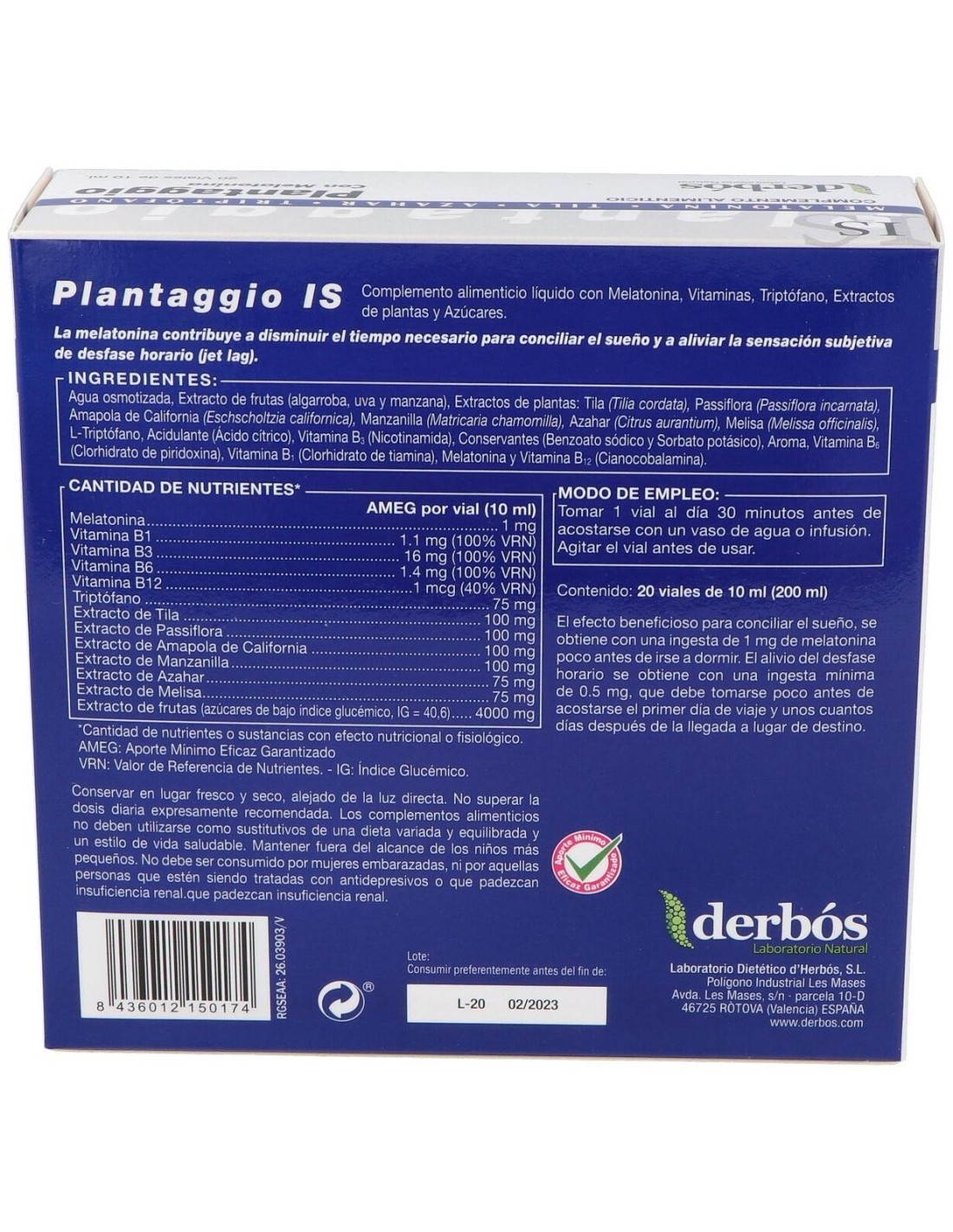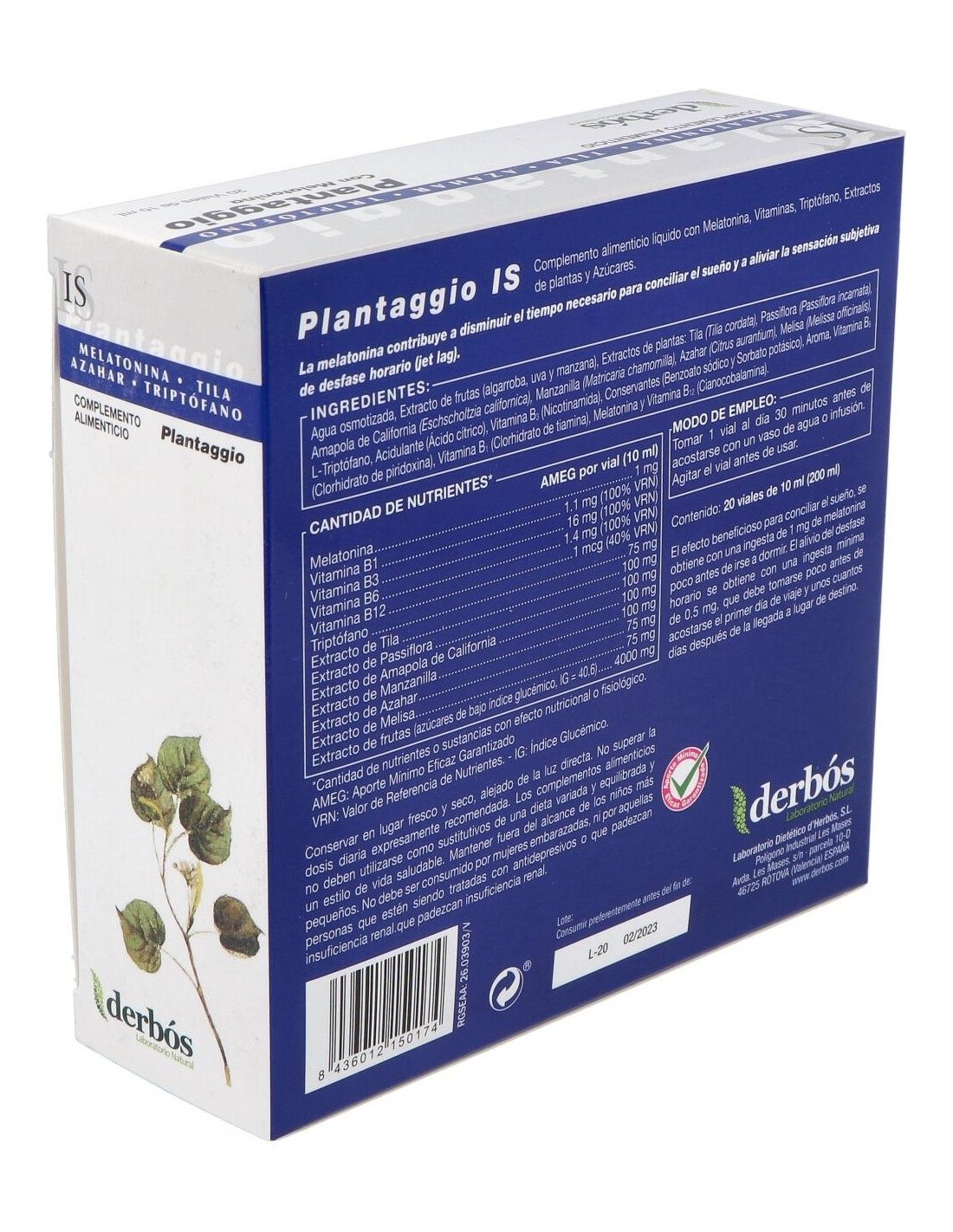 Derbos Plantaggio IS es un complemento alimenticio que ayuda a la relajación y a combatir el insomnio, favoreciendo el correcto descanso. Su fórmula contiene extractos fluidos de plantas con efecto relajante, vitaminas y l-triptófano.