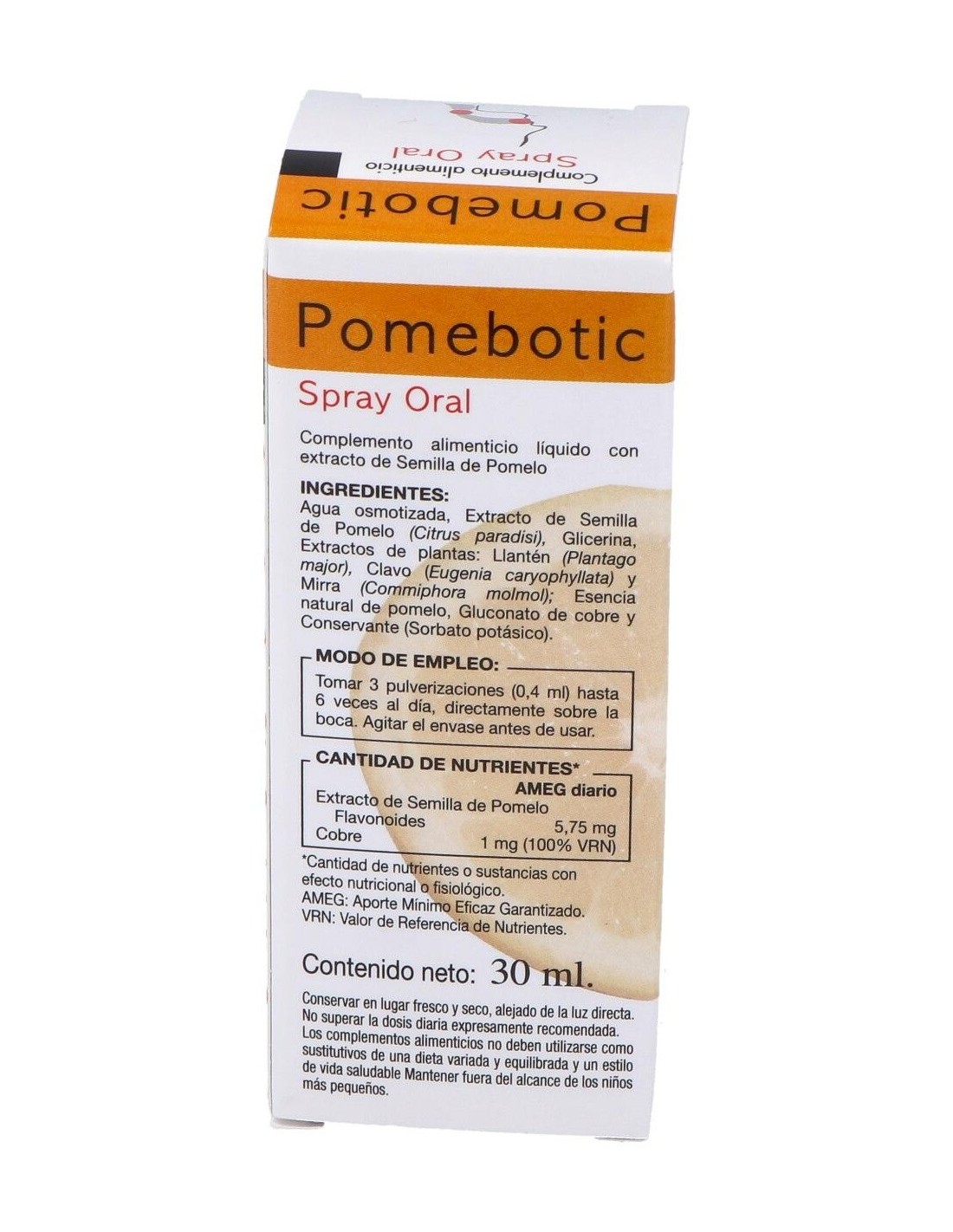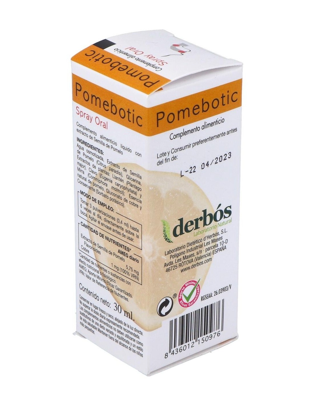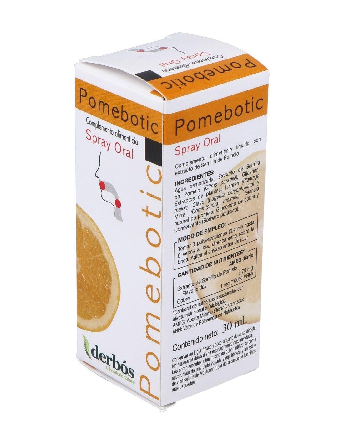 Derbós Pomebotic spray es un preparado alimenticio a base de semillas de pomelo, llantén, clavo, mirra y cobre con grandes beneficicios para tratar las molestias de garganta y cavidad bucal.