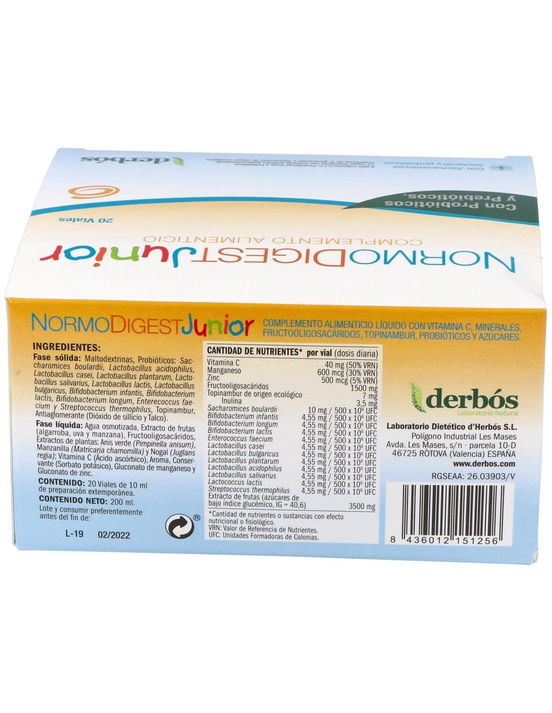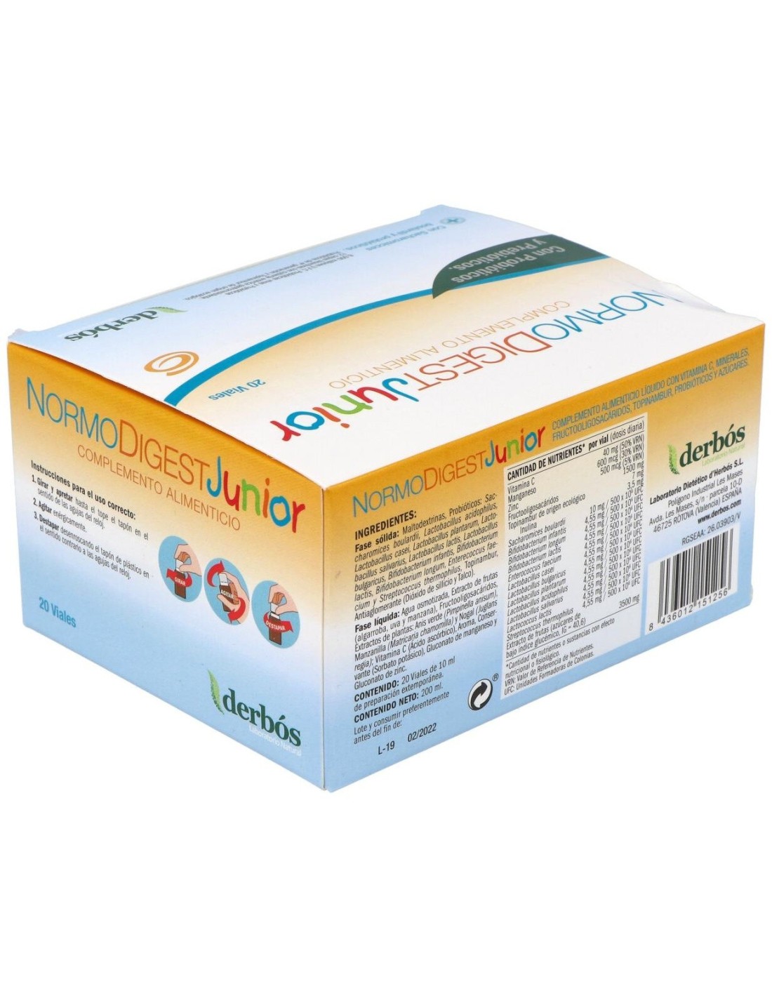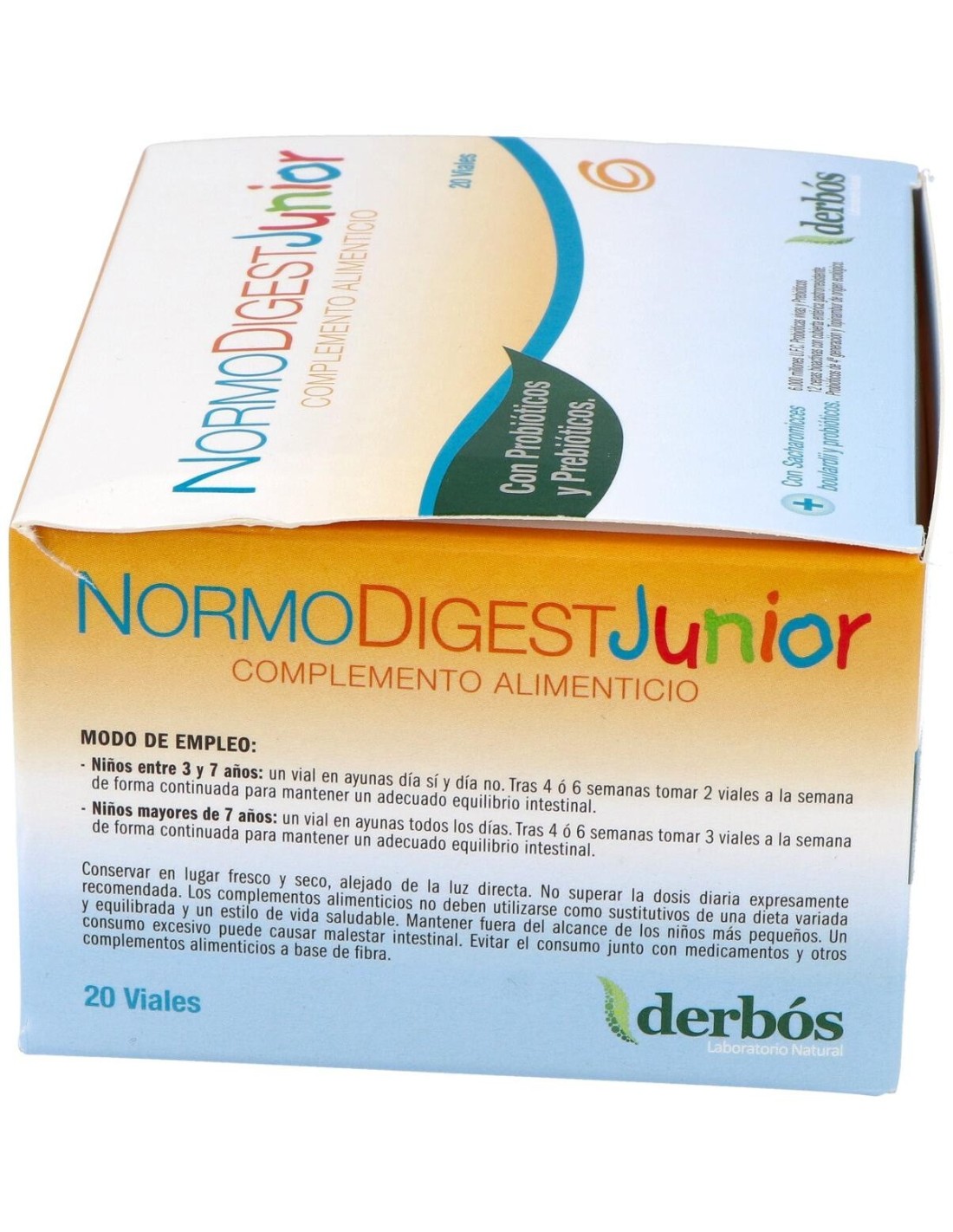 Derbos Normodigest Junior es un complemento alimenticio ayuda a activar la flora intestinal. Su fórmula con cepas bioactivas de bifidus y lactobacilos contribuye a la mejora de la asimilación de los alimentos y al refuerzo del sistema inmunitario.