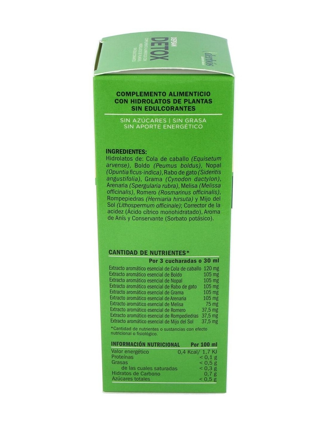 Hidrolatos de: Boldo (Peumus boldus), Cola de caballo (Equisetum arvense), Nopal (Opuntia ficus-indica), Melisa (Melissa officinalis), Rabo de gato (Sideritis angustifolia), Romero (Rosmarinus officinalis), Grama (Cynodon dactylon), Rompepiedras (Herniaria hirsuta), Arenaria (Spergularia rubra), Mijo del Sol (Lithospermum officinale), Corrector de la acidez (Ácido cítrico monohidratado), Aroma de Anís, Conservante (Sorbato potásico)