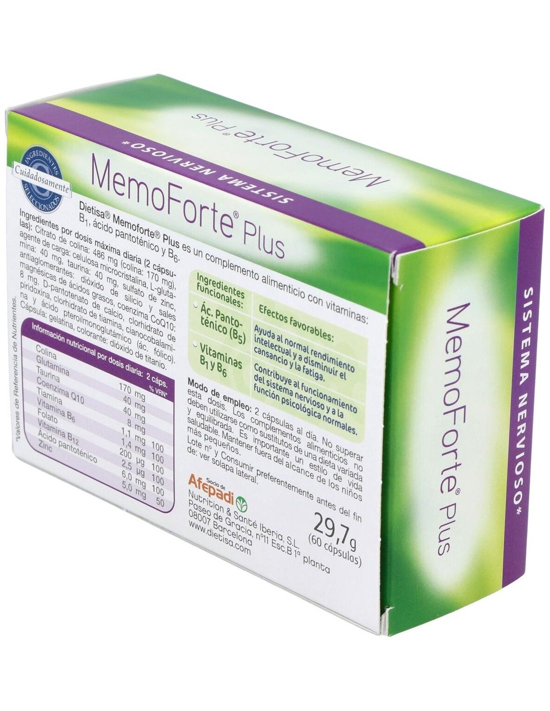 Dietisa Memoforte Plus 60cap es un complemento alimenticio formulado a base de lecitina de soja rica en fosfatidilicolina, aminoácidos, coenzima Q10 y vitaminas B1, ácido pantotémico y vitamina B6.