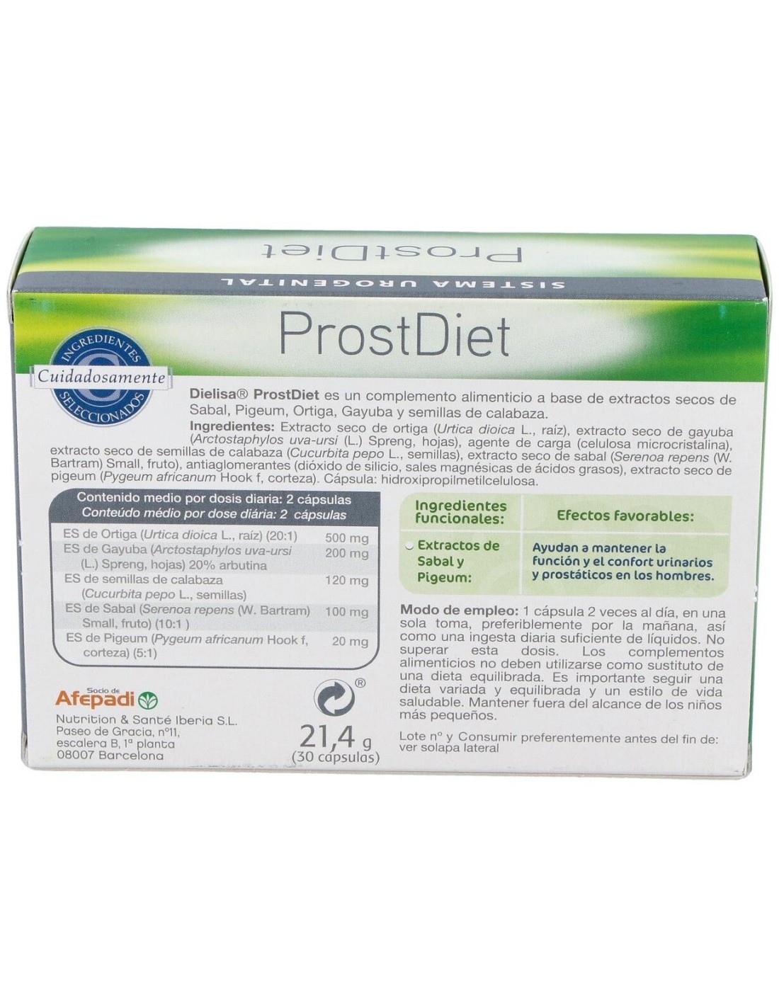 DIELISA®Complemento alimenticio que ayuda a controlar los síntomas en alteraciones prostáticas y facilita la función urinaria. Está elaborado a base de Extracto seco de Raíz de Ortiga, extracto seco de hojas de Gayuba, extracto seco de Semillas de Calabaza y antiaglomerantes: fosfato de calcio, dióxido de silicio y estearato de magnesio.