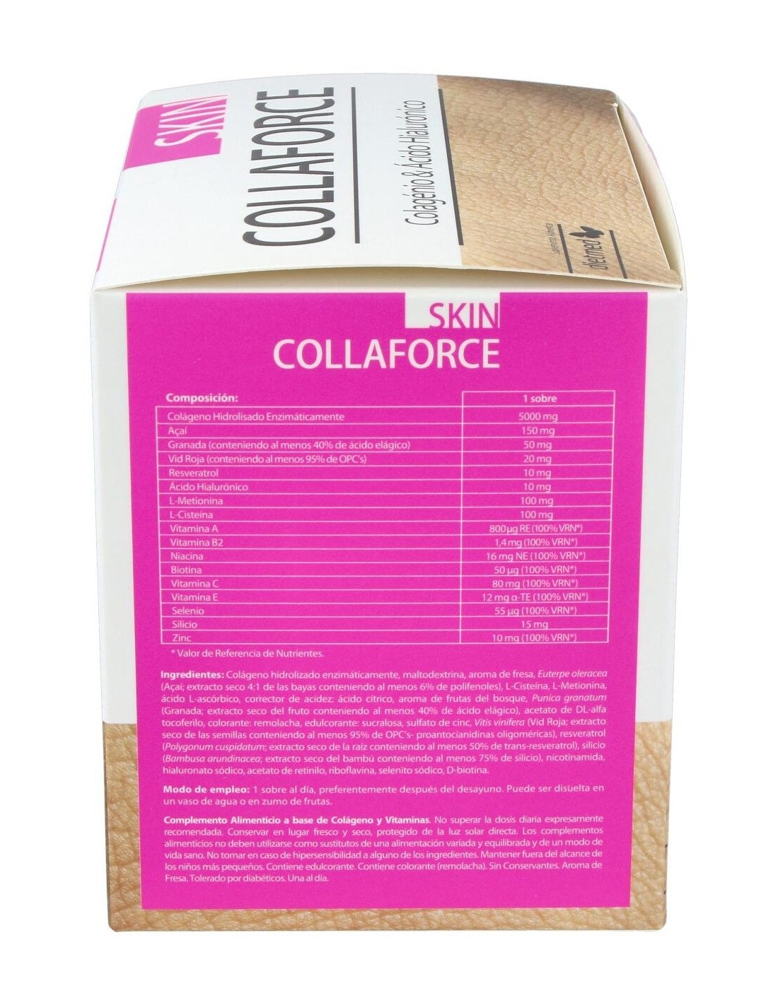 Colágeno Hidrolizado enzimáticamente, maltodextrina, aroma de fresa, Euterpe oleracea (Açaí: Extracto seco 4:1 de las bayas conteniendo al menos 6% de polifenoles), L-Cisteína, L-Metionina, ácido L-ascórbico, regulador de acidez: ácido cítrico, aroma de frutos del bosque, Punica granatum (Granada: Extracto seco del fruto conteniendo al menos 40% de ácido elágico), acetato de DL-alfa-tocoferilo, colorante: remolacha, edulcorante: sucralosa, sulfato de zinc, Vitis vinifera (Vid Roja: Extracto seco de las semillas conteniendo al menos 95% de OPCs- oligoproantocianidinas), resveratrol (Polygonum cuspidatum: Extracto seco de la raíz conteniendo al menos 50% de trans-resveratrol), silicio (Bambusa arundinacea: Extracto seco de bambú conteniendo 75% de silicio), nicotinamida, hialuronato de sodio, acetato de retinilo, riboflavina, selenito de sodio, D-biotina.