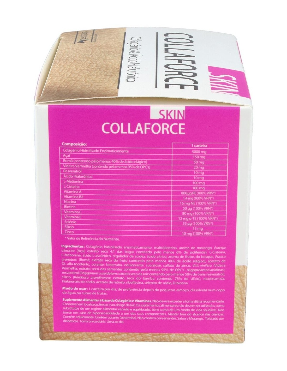 Colágeno Hidrolizado Enzimáticamente 5000 mg, Açaí 150 mg, Granada (conteniendo al menos 40% de ácido elágico) 50 mg, Vid Roja (conteniendo al menos 95% de OPCs) 20 mg, Resveratrol 10 mg, Ácido Hialurónico 10 mg, L Metionina 100 mg, L-Cisteína 100 mg, Vitamina A 800 µg RE (100% VRN*), Vitamina B2 1,4 mg (100% VRN*), Niacina 16 mg NE (100% VRN*), Biotina 50 µg (100% VRN*), Vitamina C 80 mg (100% VRN*), Vitamina E 12 mg a-TE (100% VRN*), Selenio 55 µg (100% VRN*), Silicio 15 mg, Zinc 10 mg (100% VRN*).
