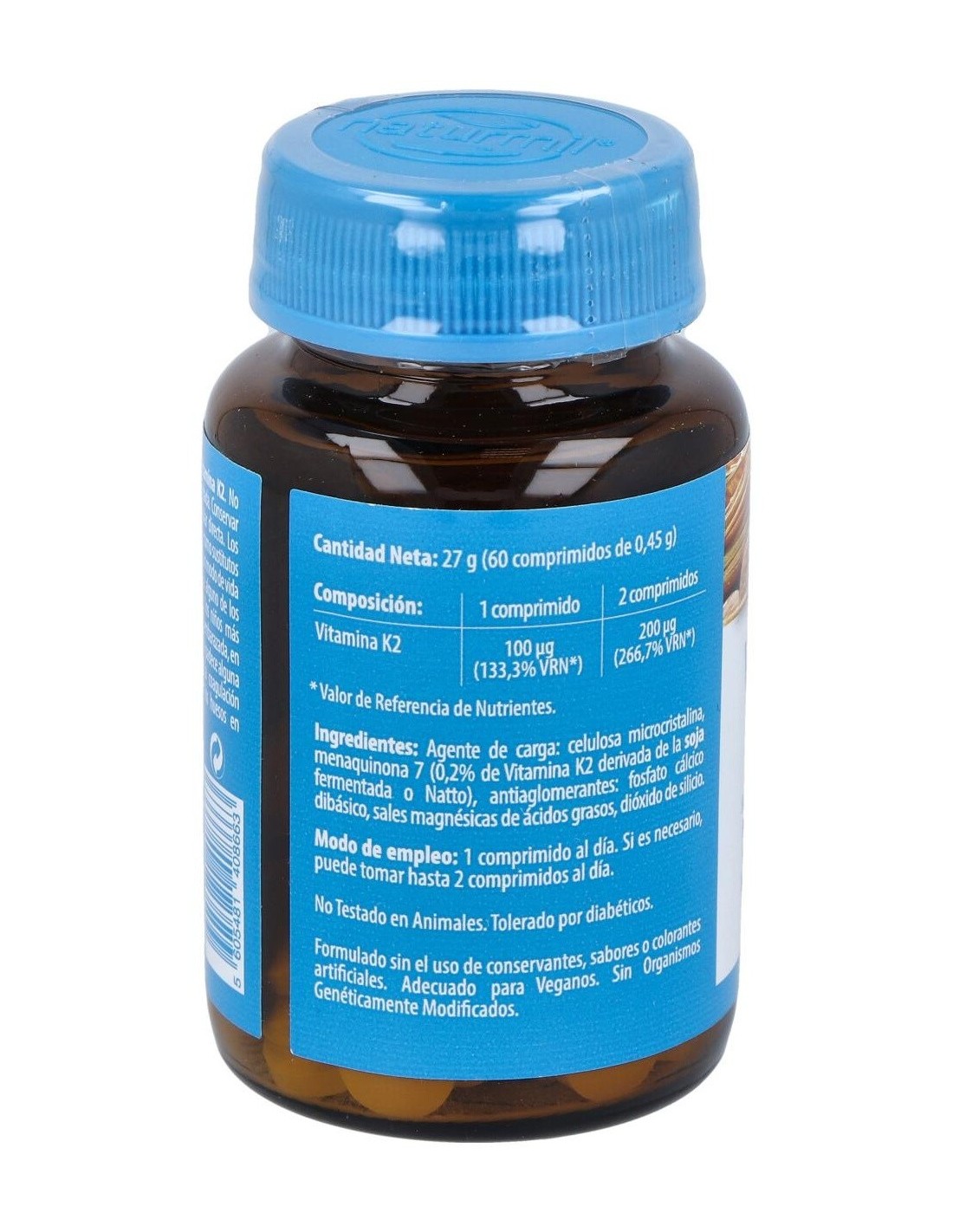 Agente de carga: celulosa microcristalina, menaquinona 7 (0,2% de Vitamina K2 derivada de la soja fermentada o Natto), antiaglomerantes: fosfato cálcico dibásico, magnesio estearato, dióxido de silicio. Por 1 comprimido: Vitamina K2: 100 mcg.