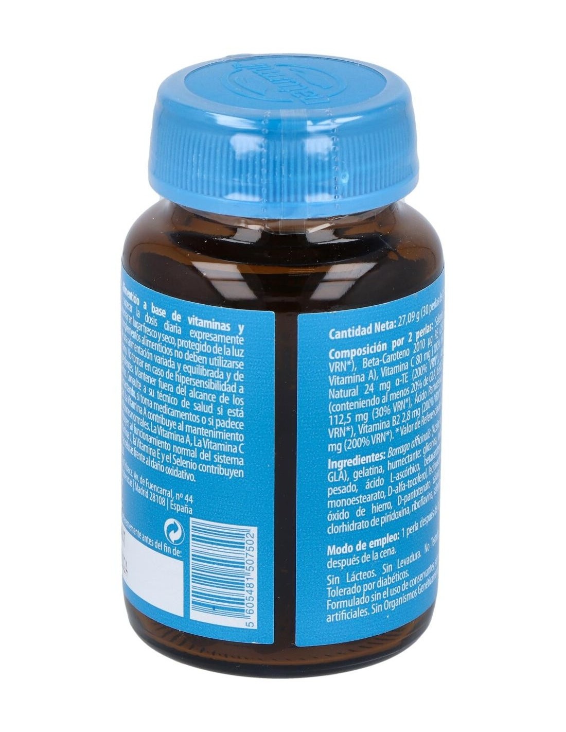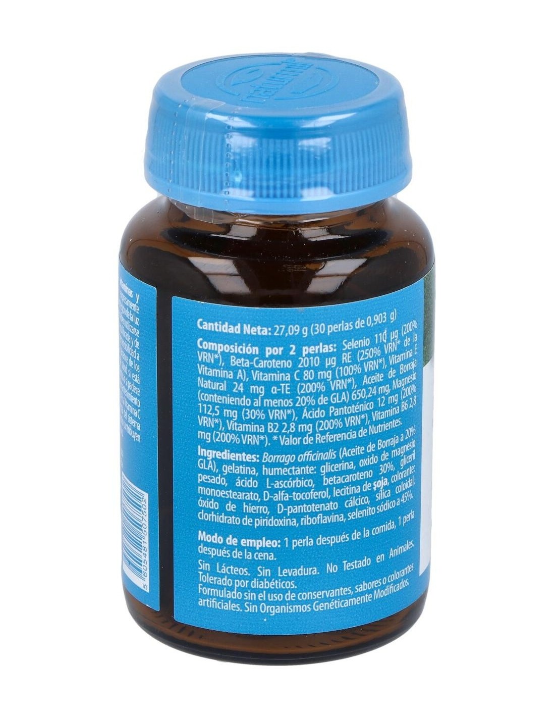 Selenio 110 µg (200% VRN*): Betacaroteno 2010 µg RE (250 % VRN* en Vitamina A): Vitamina C 80 mg (100% VRN*): Vitamina E natural 24 mg a-TE (200% VRN*): Aceite de Borraja (contendo 20% GLA) 650,24 mg: Magnesio 112,5 mg (30% VRN*): Ácido Pantoténico 12 mg (200% VRN*): Vitamina B2 2,8 mg (200% VRN*): Vitamina B6 2,8 mg (200% VRN*).