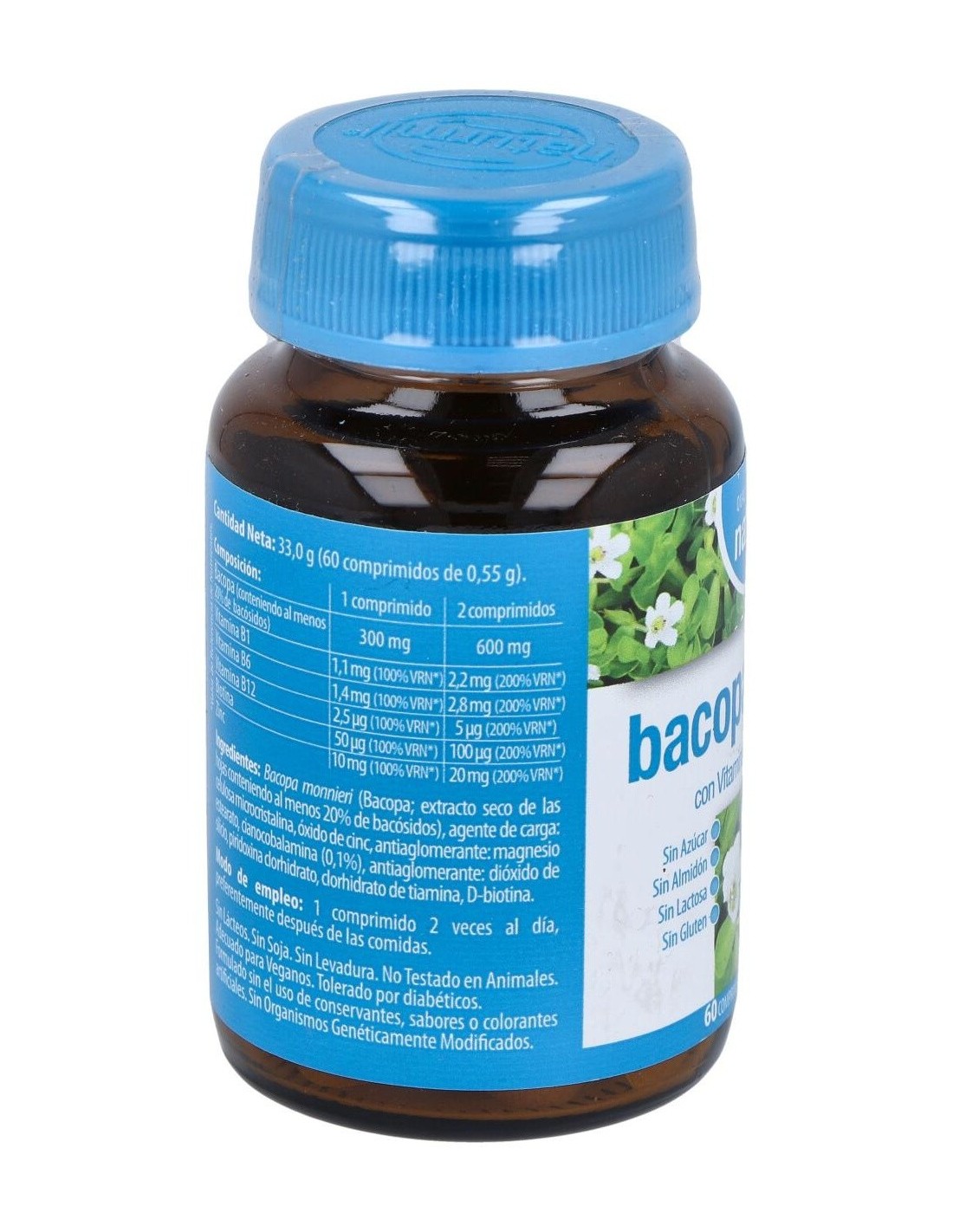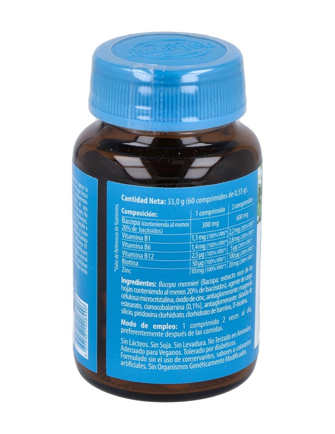 Bacopa (contiene al menos 20% bacósidos) 600 mg Vitamina B1 2,2 mg (200% VRN*), Vitamina B6 2,8 mg (200% VRN*), Vitamina B12 5 u µg (200 % VRN*), Biotina 100 µg (200% VRN *), Zinc 20 mg (200% VRN*).
