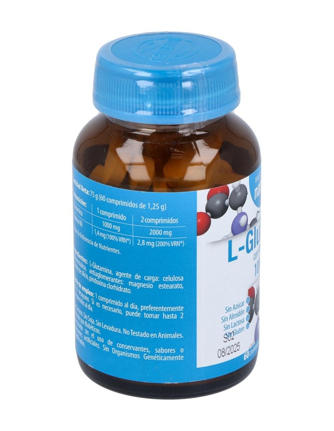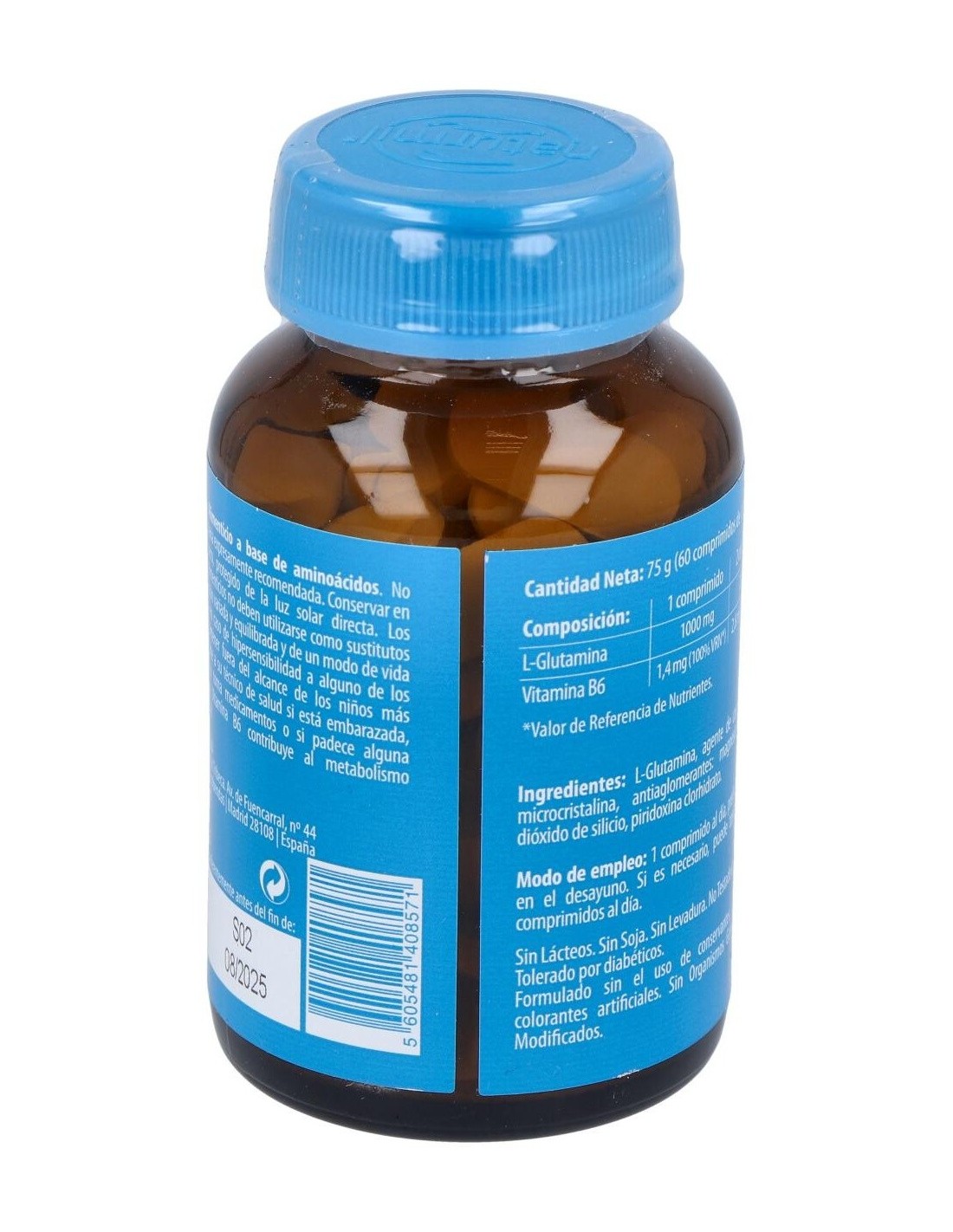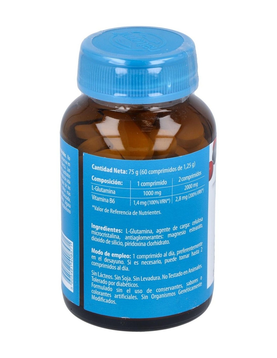 L-Glutamina, Agente de carga: celulosa microcristalina, antiaglomerantes: estearato de magnesio, dióxido de silicio, clorhidrato de piridoxina.