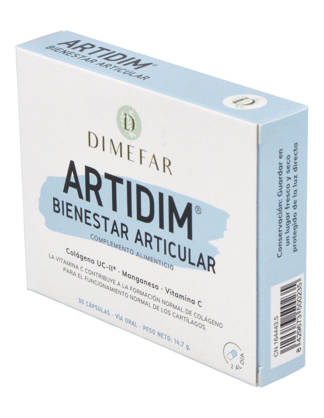 Dimefar Artidim 30Cáps es un complemento alimenticio a base de colágeno tipo II no hidrolizado, manganeso y vitamina C que contribuye a mantener la salud articular.