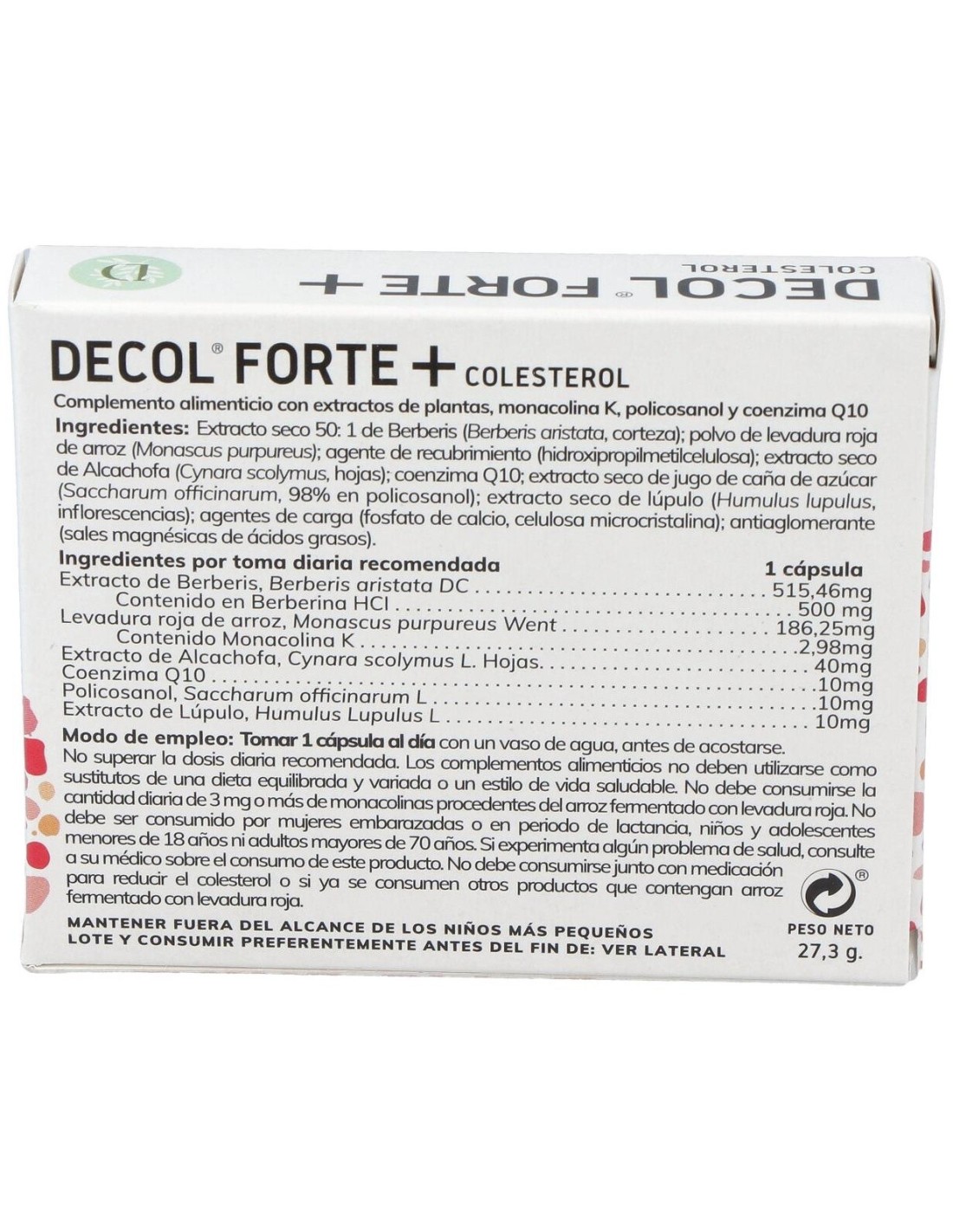 Complemento alimenticio presentado en forma de cápsulas, basado en una sinergia de nutrientes con monacolina K. Contribuye al mantenimiento de niveles normales de colesterol. La monacolina K procede de la fermentación de la levadura roja de arroz, y se potencia a través de la combinación de los extractos de berberis y lúpulo, policosanol y coenzima Q10. Adecuado para adultos.