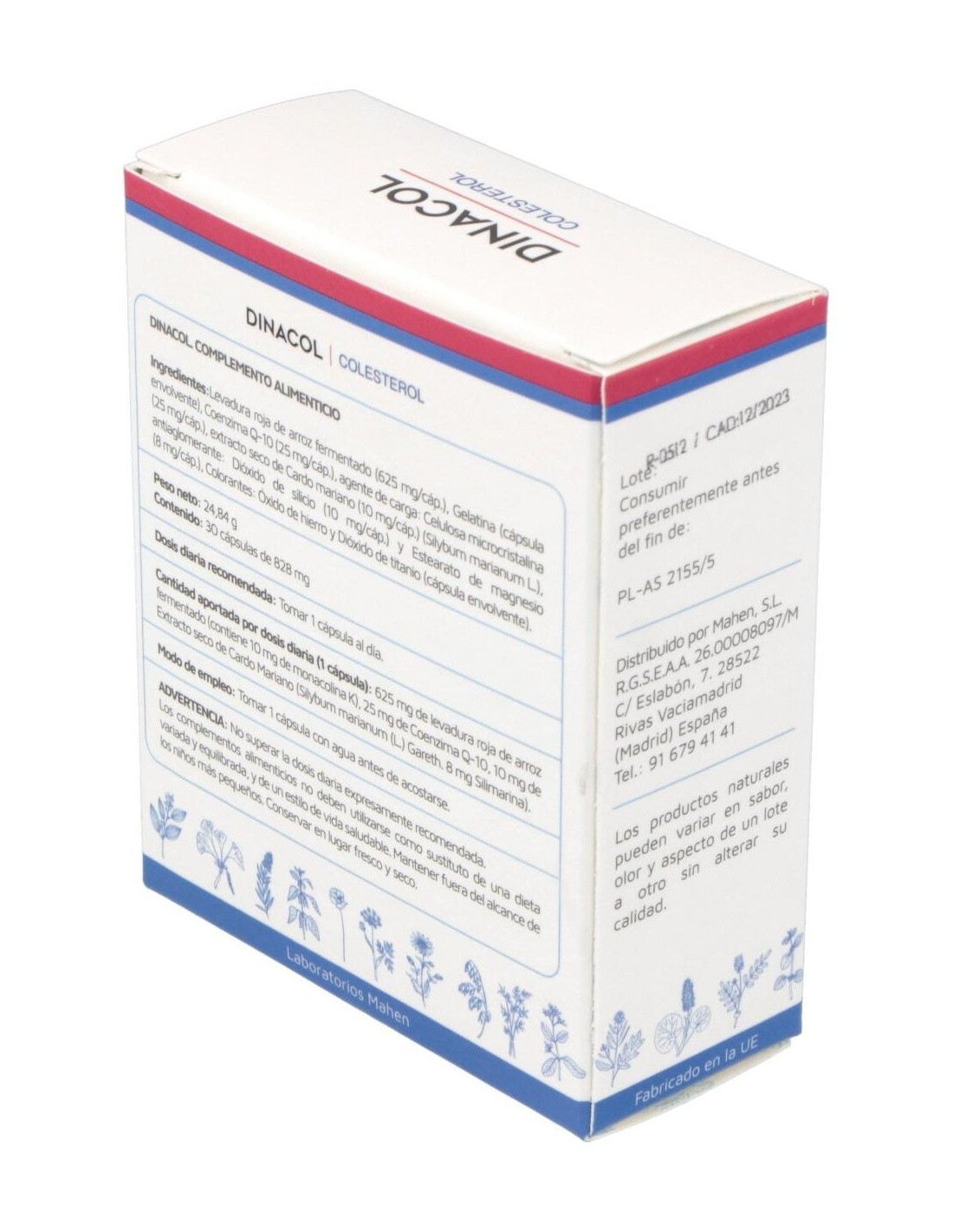 ARROZ DE LEVADURA ROJA FERMENTADO (625 MG/CAP)- GELATINA (CÁPSULA ENVOLVENTE)- COENZIMA Q-10 (25 MG/CAP)- AGENTE DE CARGA: CELULOSA MICROCRISTALINA (25 MG/CAP), EXTRACTO SECO DE CARDO MARIANO (10 MG/CAP) (SILYBUM MARIANUM L.)- ANTIAGLOMERANTE: DIÓXIDO DE SILICIO (10 MG/CAP) Y ESTEARATO DE MAGNESIO (8 MG/CAP)- COLORANTES: E-172 Y E-171 (CÁPSULA ENVOLVENTE)DOSIS DIARIA RECOMENDADA:1 CÁPSULA AL DÍA.MODO DE EMPLEO:TOMAR UNA CÁPSULA CON AGUA O ZUMO ANTES DE ACOSTARSE.PRESENTACIÓN:ENVASE DE 30 CÁPSULAS DE 828 MG.CANTIDAD APORTADA POR DOSIS DIARIA:- 625 MG DE ARROZ DE LEVADURA ROJA FERMENTADO (CONTIENE 10 MG DE MONOCOLINA K)- 25 MG DE COENZIMA Q-10- 10 MG DE EXTRACTO SECO DE CARDO MARIANOLABORATORIO.