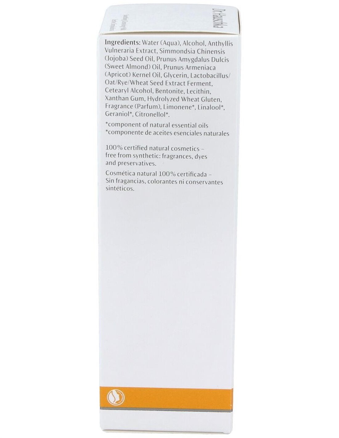 Aqua, Alcohol, Anthyllis Vulneraria Extract, Simmondsia Chinensis Seed Oil, Prunus Amygdalus Dulcis Oil, Prunus Armeniaca Kernel Oil, Glycerin, Lactobacillus/Oat/Rye/ Wheat Seed Extract Ferment, Cetearyl Alcohol, Bentonite, Lecithin, Xanthan Gum, Hydrolyzed Wheat Gluten, Parfum*, Limonene*, Linalool*, Geraniol*, Citronellol*.