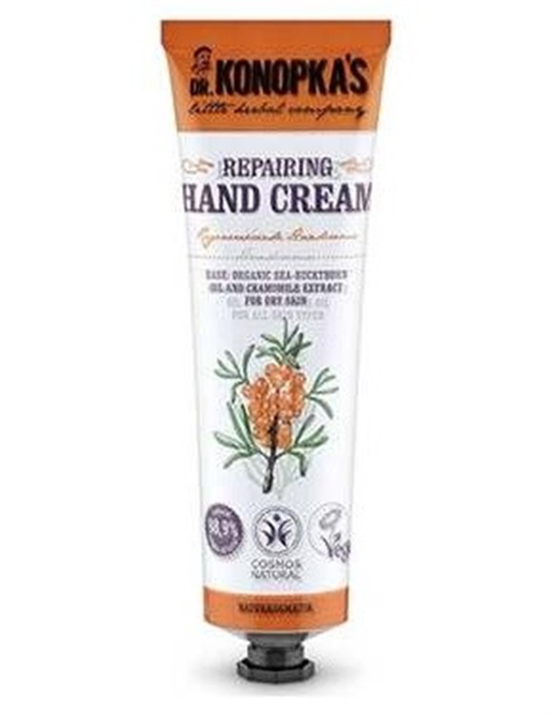 DR. KONOPKA´SEsta crema de manos reparadora natural y certificada está basada en la receta del Dr. Konopkas para el cuidado de pieles secas. Contiene espino amarillo orgánico para nutrir la piel e hidratarla y facilitar la regeneración de la piel. El extracto de manzanilla calma y suaviza la piel. Producto vegano. Cosmos Natural.