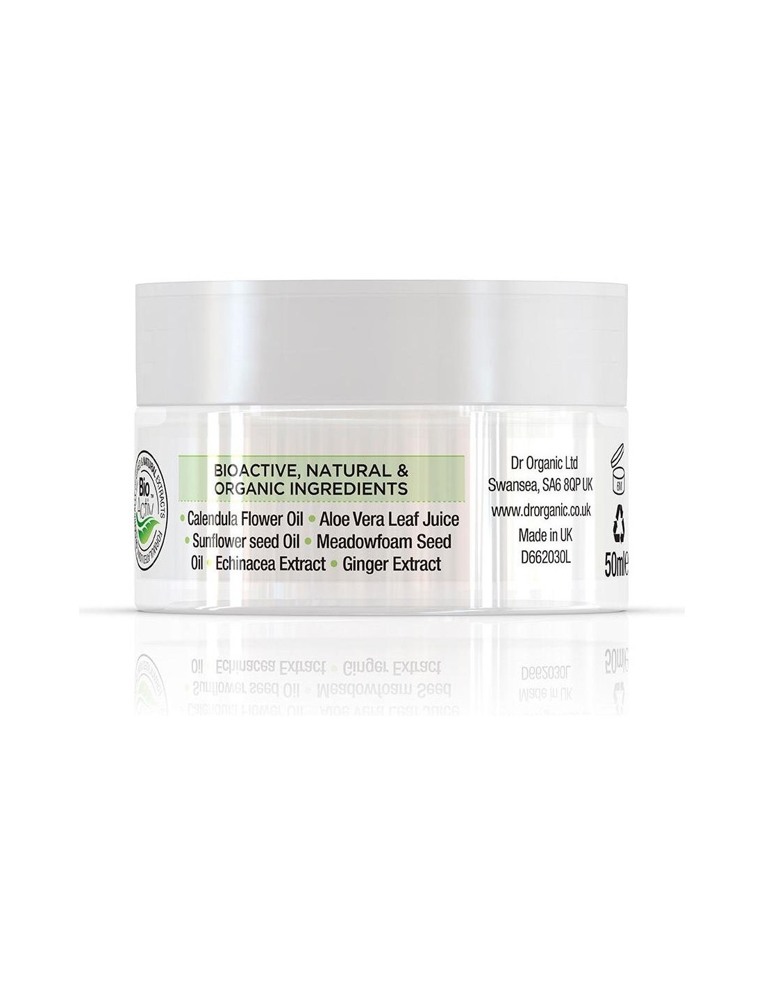 Aloe barbadensis leaf juice, Aqua, Caprylic/Capric triglyceride, Cetearyl alcohol, Glycerin, Glyceryl stearate, Cetyl ricinoleate, Cetearyl glucoside, Calendula officinalis (Calendula) flower oil, Helianthus annuus (Sunflower) seed oil, Limnanthes alba (Meadowfoam) seed oil, Echinacea purpurea (Echinacea) extract, Zingiber officinale (Ginger) extract, Sodium stearoyl glutamate, Tocopheryl acetate, Xanthan gum, Bisabolol, Chondrus crispus powder, Citric acid, Sodium phytate, Hydroxyacetophenone, Benzyl alcohol, Dehydroacetic acid.
