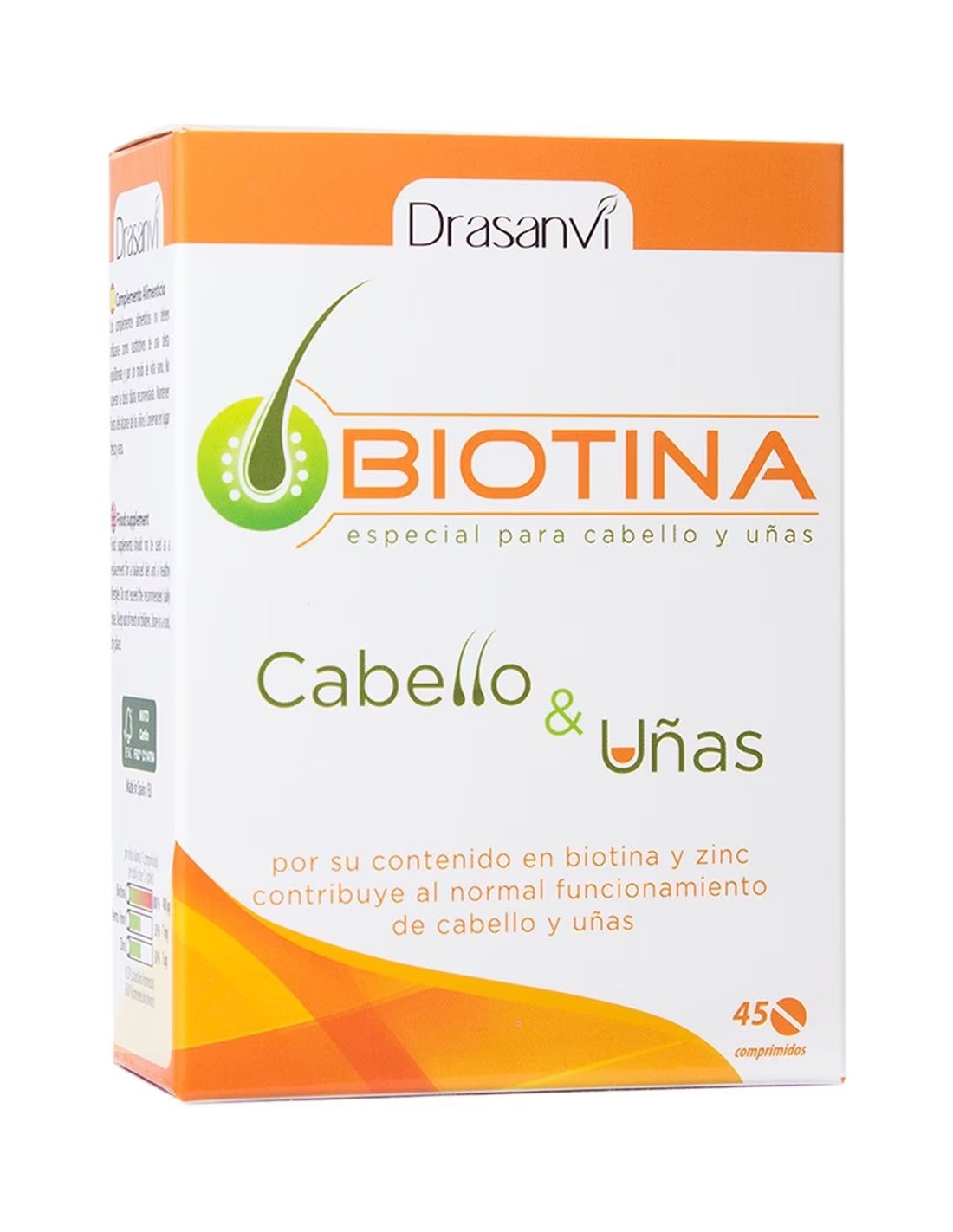DRASANVIContribuye al mantenimiento del cabello en condiciones normales. Es un complemento alimenticio, que combina la Biotina (también llamada Vitamina B7) con el Hierro y Zinc.