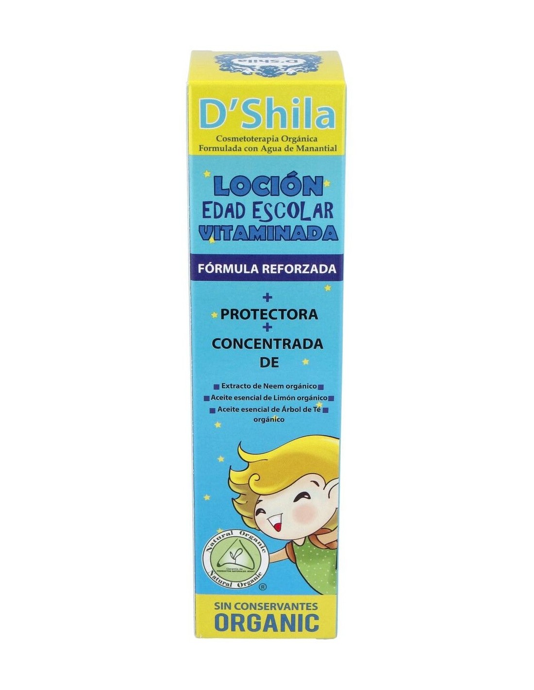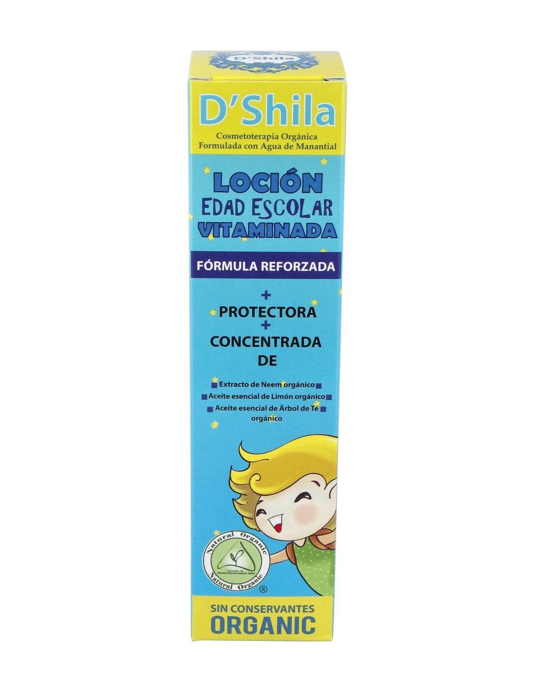 La loción vitaminada para niños de D'shila higieniza el cabello de los niños en edad escolar. Indicado para prevenir la formación de piojos, es una loción preventiva y totalmente natural. Contiene proteínas reestructurantes de trigo, albahaca, aloe vera obtenido de cultivo orgánico y aceites esenciales de limón con propiedades suavizantes.