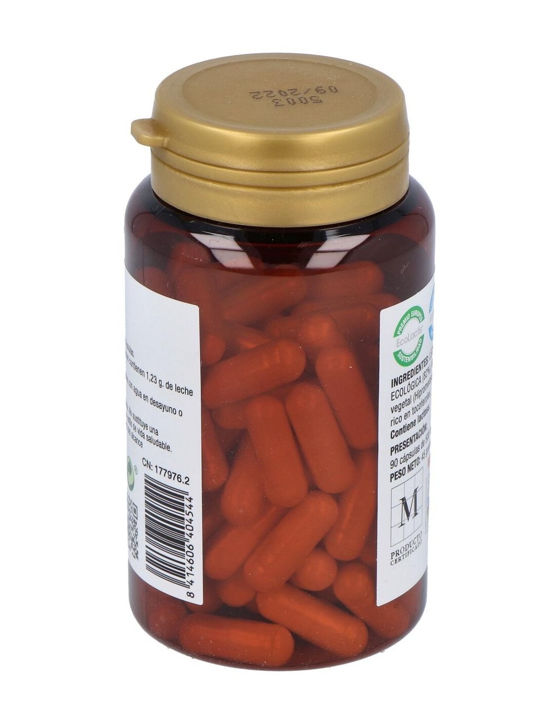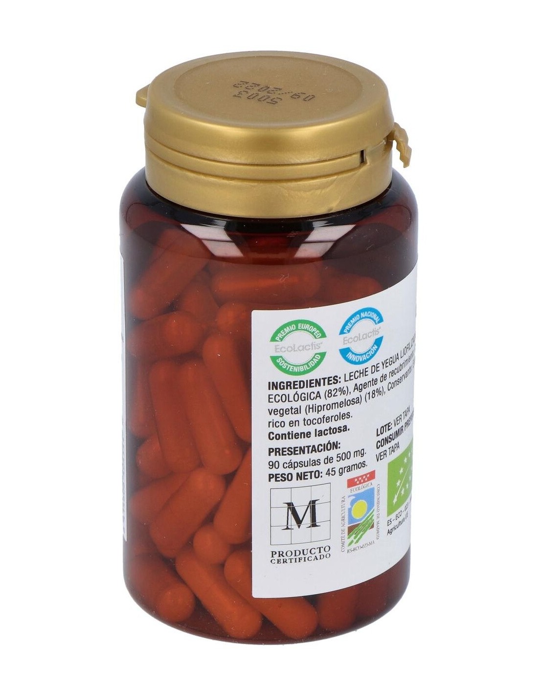 Leche de yegua liofilizada ecológica (82%), agente de recubrimiento: cápsula vegetal (hipromelosa) (18%), conservante: vitamina e (extracto rico en tocoferol).