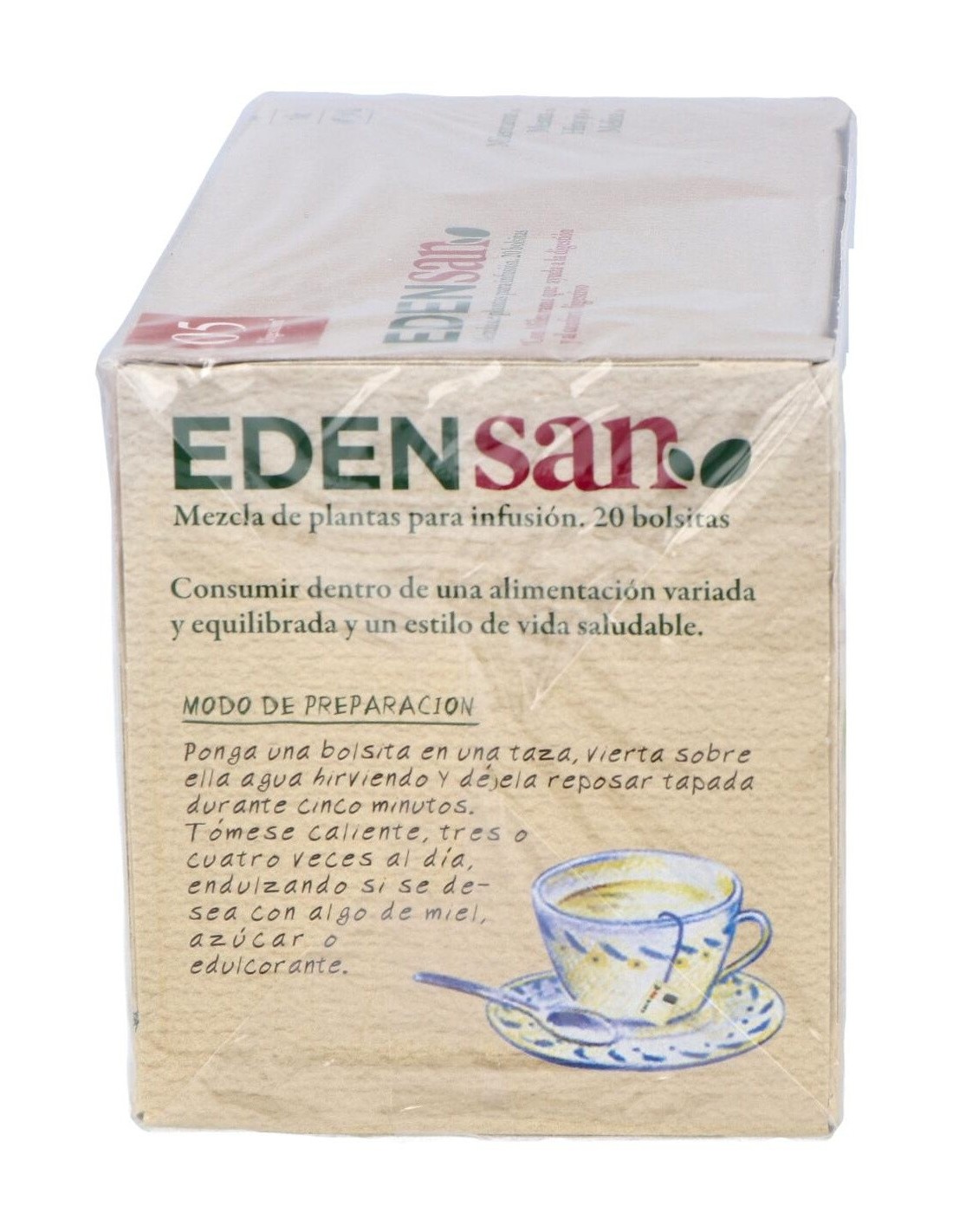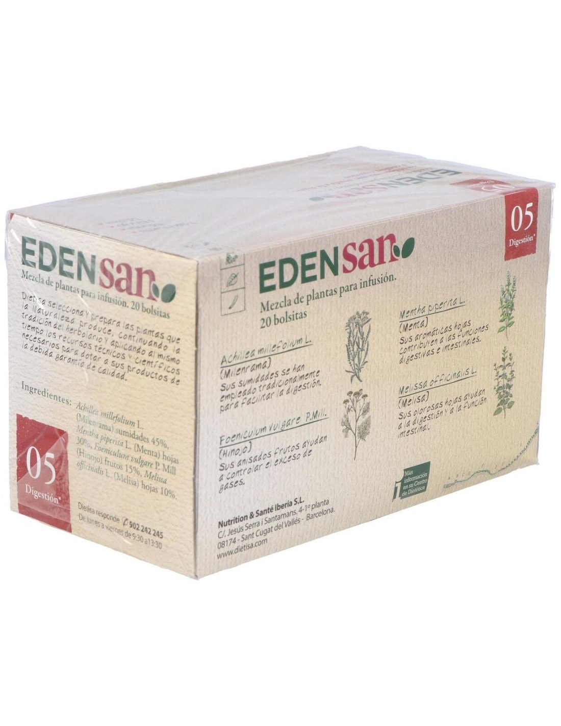 Edensan digestión 05 de Dietista mezcla diversas plantas con las que se obtiene una infusión con prodiedades digestivas. Su composición está realizada a base de milenrama, menta, hinojo y melisa.