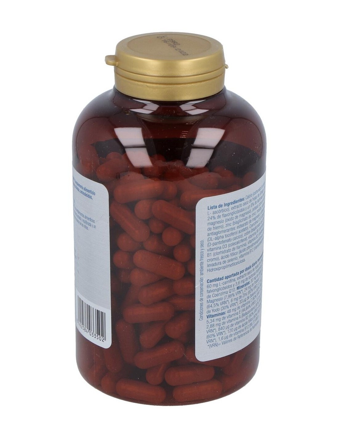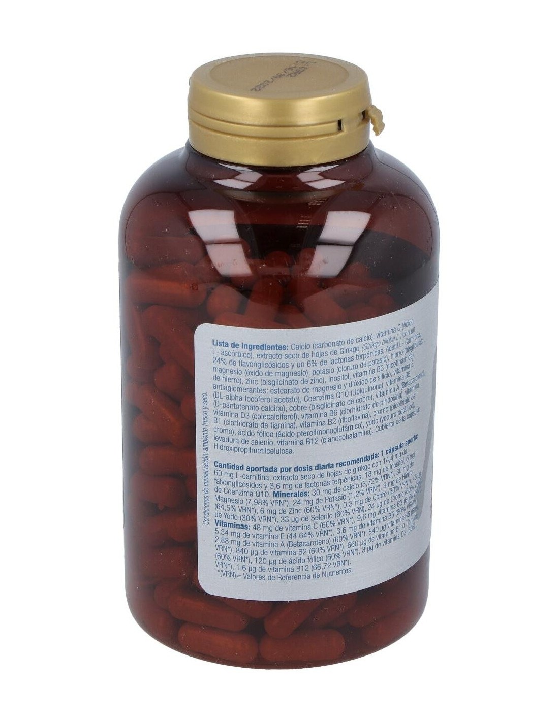 Calcio (carbonato de calcio), vitamina C (Ácido L- ascórbico), extracto seco de hojas de Ginkgo (Ginkgo biloba L.) con un 24% de flavonglicósidos y un 6% de lactonas terpénicas, Acetil LCarnitina, magnesio (óxido de magnesio), potasio (cloruro de potasio), hierro (bisglicinato de hierro), zinc (bisglicinato de zinc), inositol, vitamina B3 (nicotinamida), antiaglomerantes: estearato de magnesio y dióxido de silicio, vitamina E (DL-alpha tocoferol acetato), Coenzima Q10 (Ubiquinona).