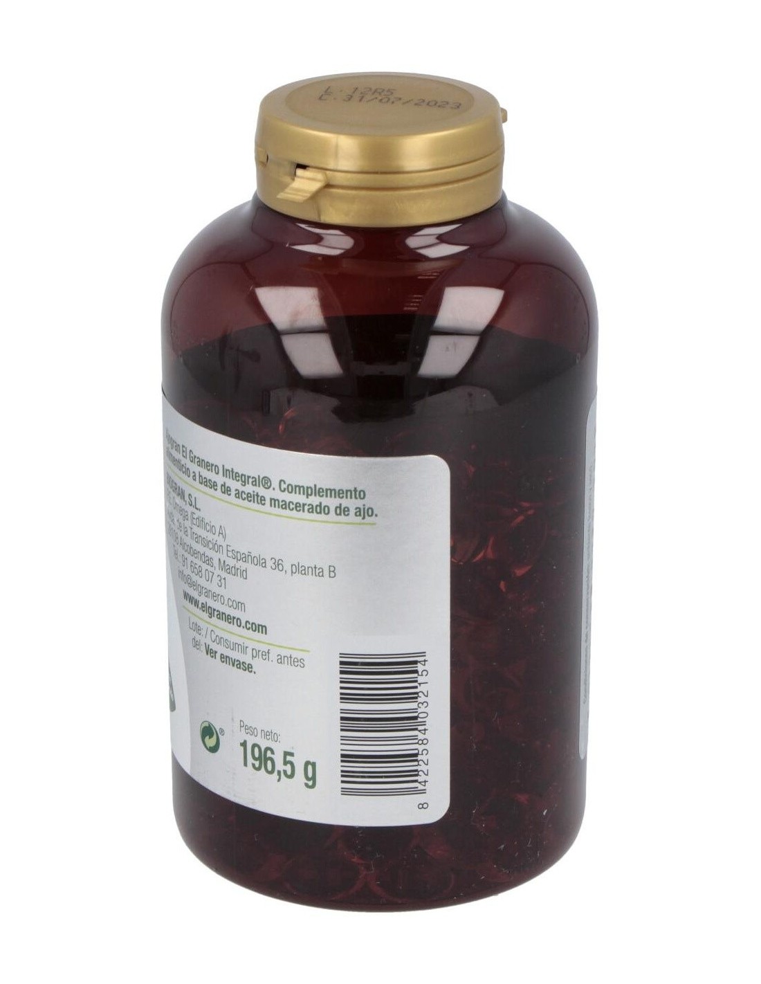 Aceite macerado de bulbos de ajo (Allium sativum L.) con un 0,12% de alicina. Cubierta de la perla: gelatina, estabilizante glicerol.