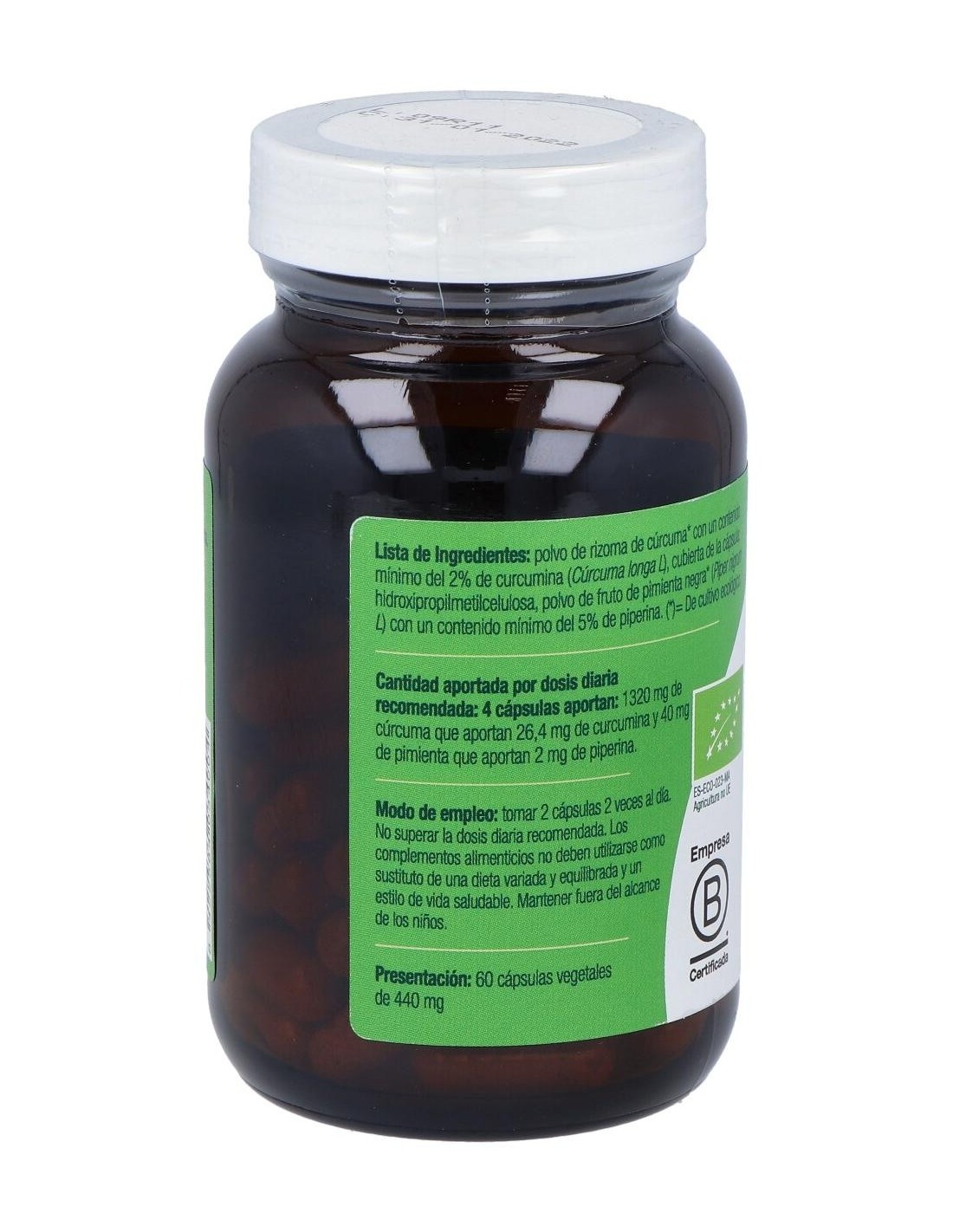 Por 1 cápsula: Polvo de cúrcuma rizoma (95%), Polvo del frito de pimienta negra (5%), Hidroxipropilmetilcelulosa, Extracto de Pimienta Negra, Cúrcuma, Polvo de rizoma de cúrcuma, Polvo de fruto de pimienta negra.