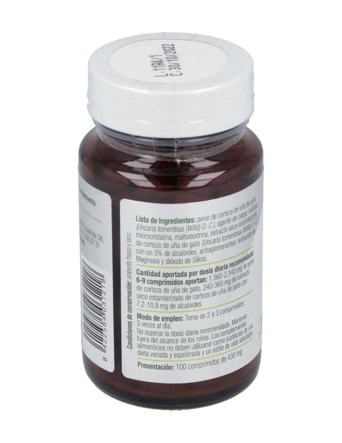Uña de gato planta (260 mg), uña de gato e.s. (40 mg), celulosa vegetal, dióxido de silicio y estearato de magnesio.