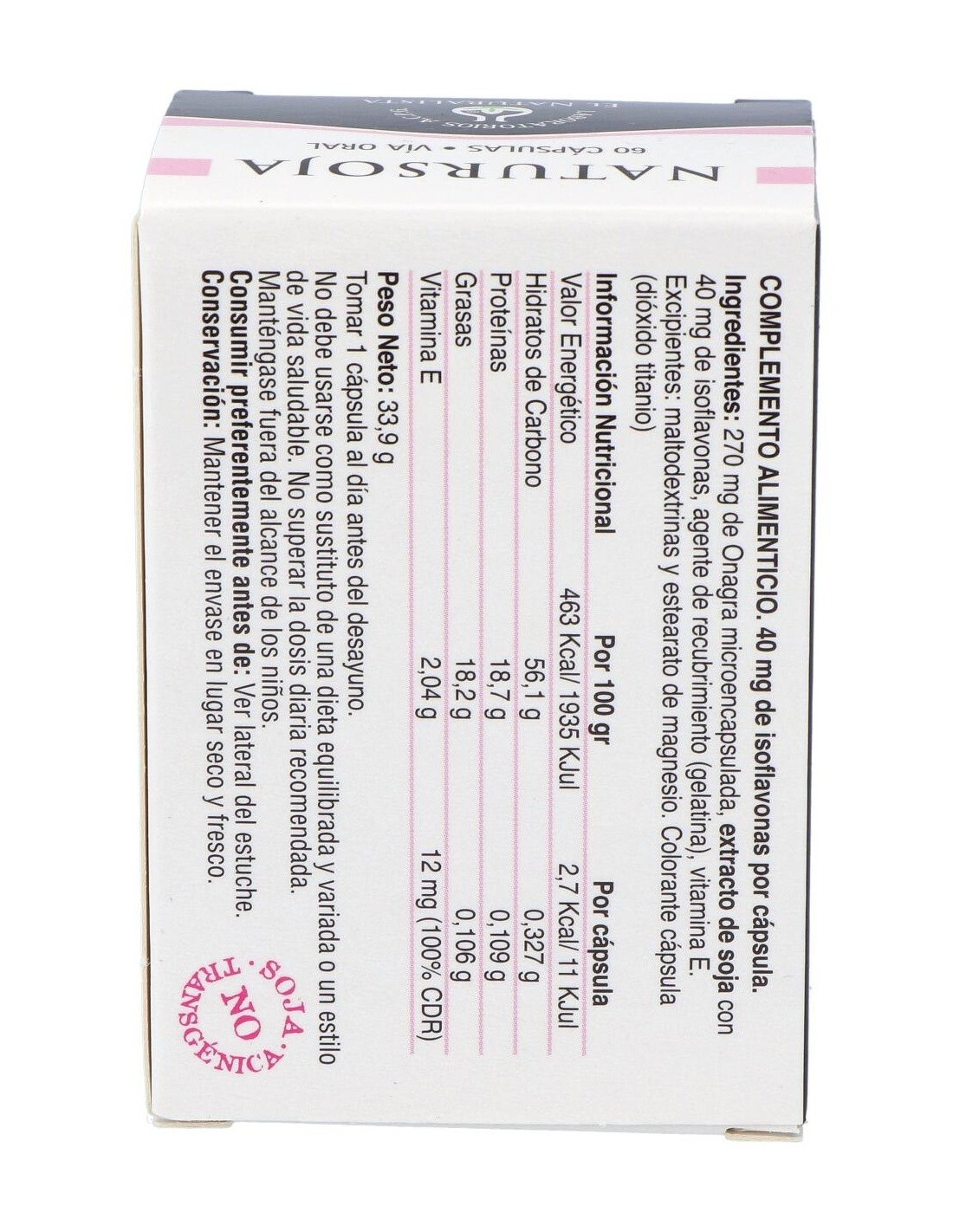 Extracto de soja con un aporte de 40 mg de isoflavonas, 270 mg de aceite de onagra microencapsulada, 20 mg de Vitamina E al 50%.