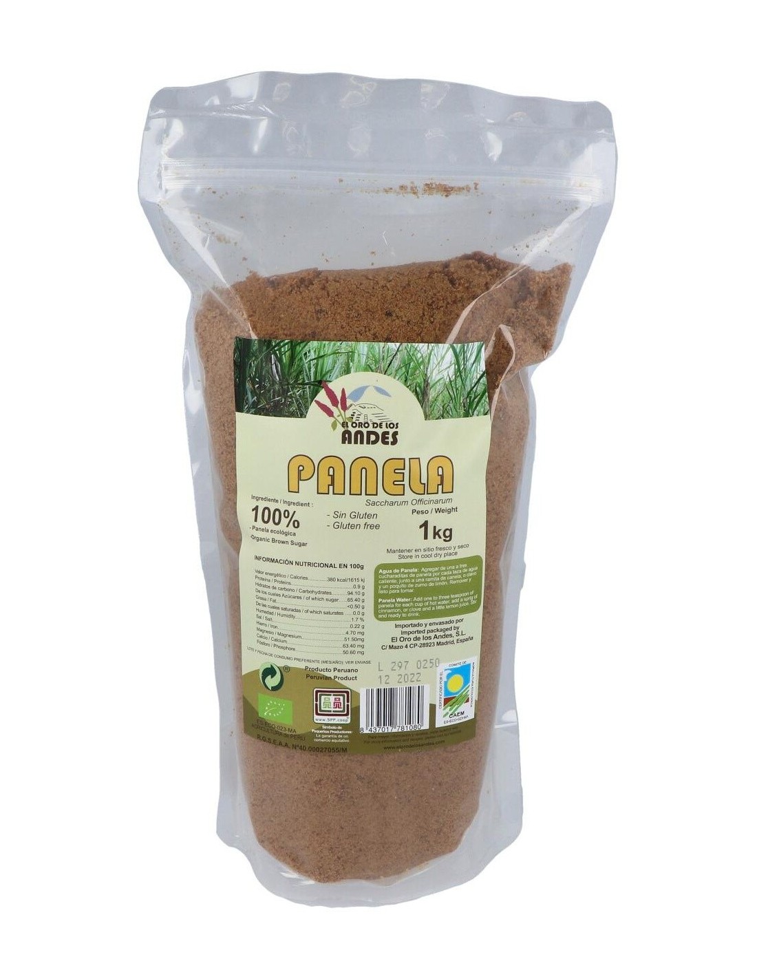 EL ORO DE LOS ANDESEste tipo de azúcar no sufre ningún tipo de refinamiento, ni otro tipo de procesamiento químico (adición de clarificantes, floculantes, etc) Este tipo de azúcar no sufre ningún tipo de refinamiento, ni otro tipo de procesamiento químico (adición de clarificantes, floculantes, etc)Precauciones:No se han descrito.Composición:Panela (Saccharum Officinarum) granulada (producto de la concentración de los jugos de la caña de azúcar)Modo de empleo:Sirve para endulzar.